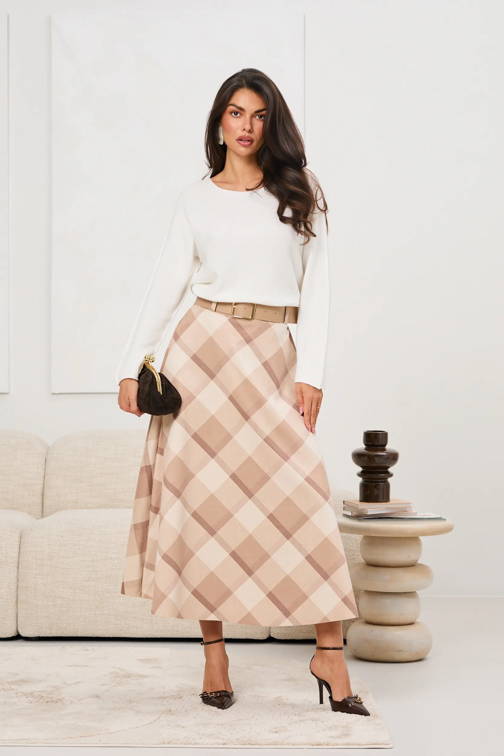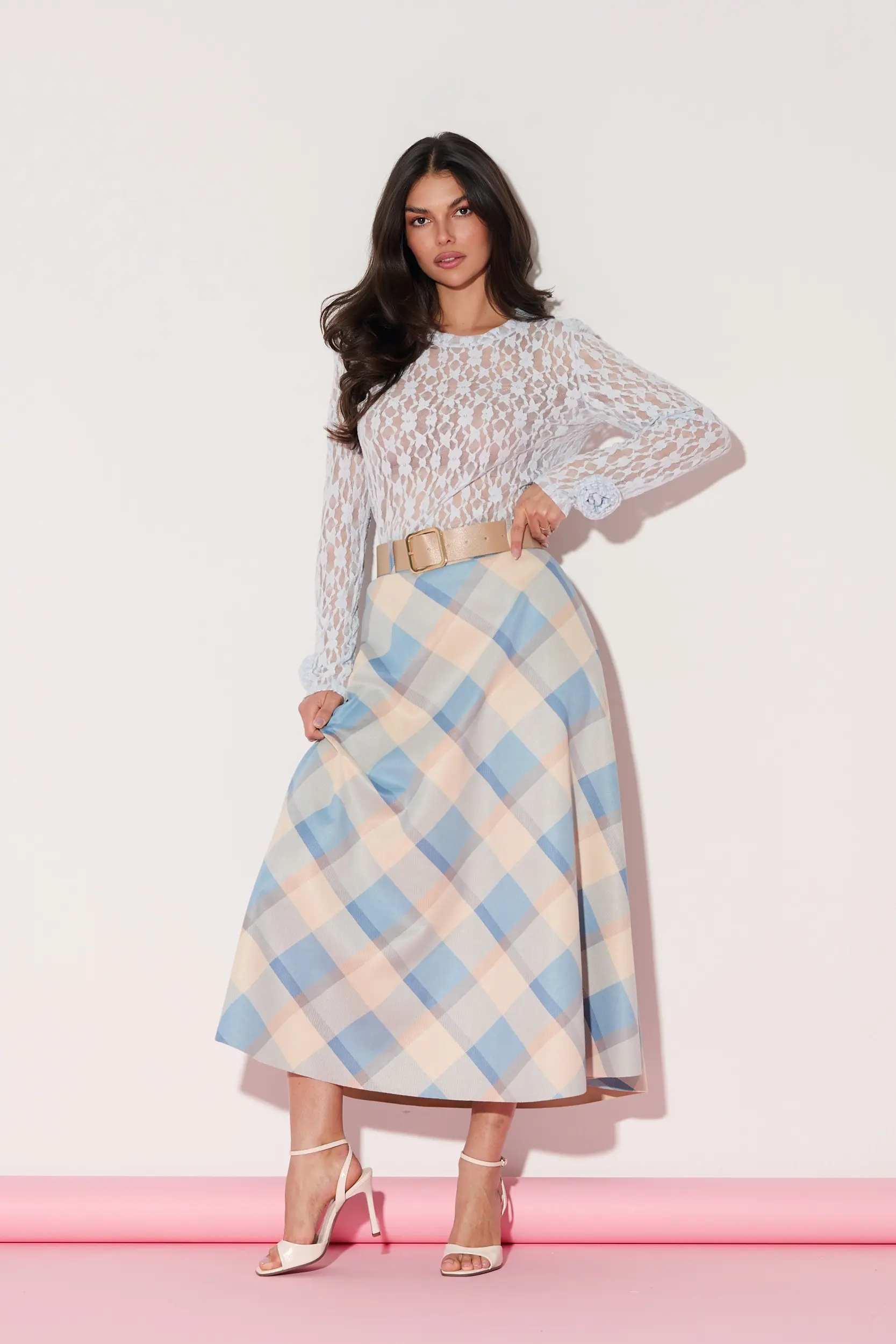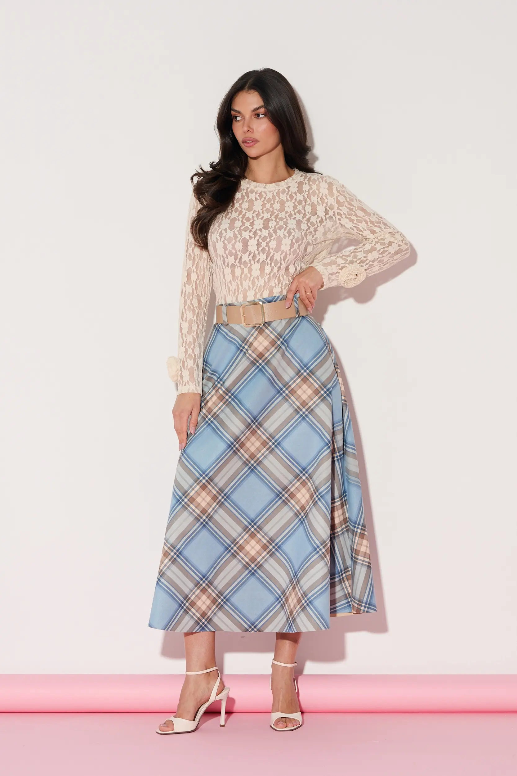 Elegancka spódnica midi w subtelną, pastelową kratę to doskonałe połączenie klasyki i nowoczesnych trendów. Model o długości midi pięknie układa się na sylwetce, zapewniając komfort noszenia i kobiecy wygląd. Delikatna kolorystyka sprawia, że spódnica prezentuje się lekko i świeżo, idealnie wpisując się w wiosenno-letnie kolekcje. Spódnica posiada dołączony pasek, który podkreśla talię i nadaje całości eleganckiego charakteru. Rozkloszowany fason zapewnia swobodę ruchów oraz atrakcyjny wygląd zarówno w stylizacjach casualowych, jak i bardziej formalnych.