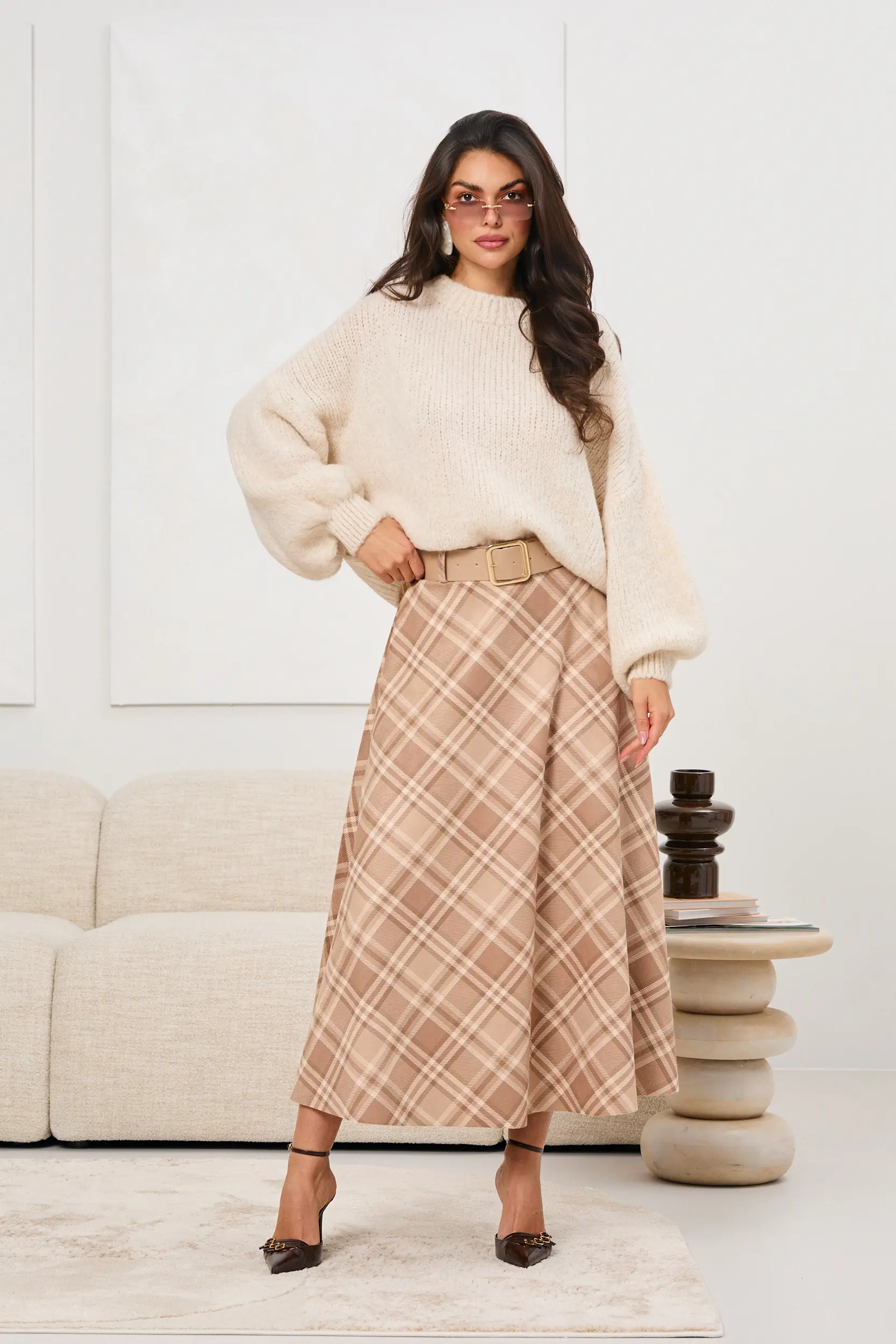 Spódnica o długości midi z paskiem w klasyczną kratę, uszyta z miękko układającej się tkaniny, która zapewnia komfort noszenia i elegancki wygląd. Model o lekko rozkloszowanym kroju pięknie podkreśla talię i optycznie wysmukla sylwetkę, a gładkie wykończenie pasa pozwala na stylowe zestawienie z paskiem.