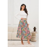 Spódnica o długości midi wykonana z miękkiej, przyjemnej w dotyku tkaniny, wyróżnia się efektownym, wielobarwnym kwiatowym wzorem inspirowanym motywami botanicznymi, który nadaje stylizacji kobiecego i świeżego charakteru. Model posiada lekko rozkloszowany krój z delikatnymi kontrafałdami, dzięki czemu pięknie układa się w ruchu i podkreśla sylwetkę, jednocześnie zapewniając komfort noszenia. Wysoki stan akcentuje talię, a dołączony szeroki pasek z ozdobną klamrą dodaje całości elegancji i stanowi stylowy detal.