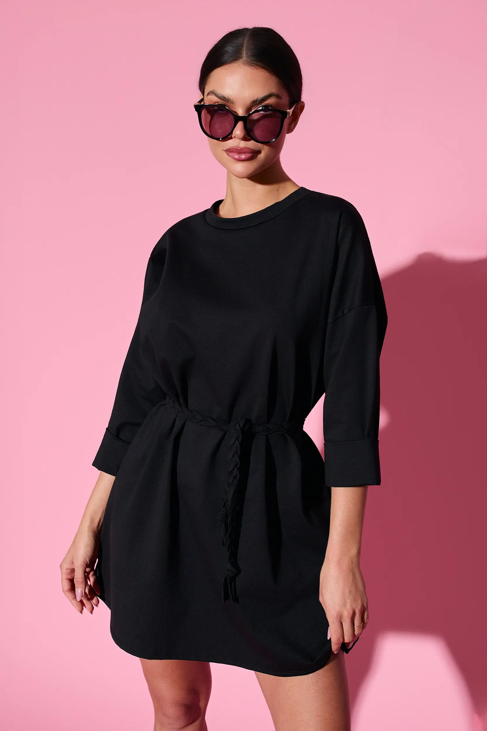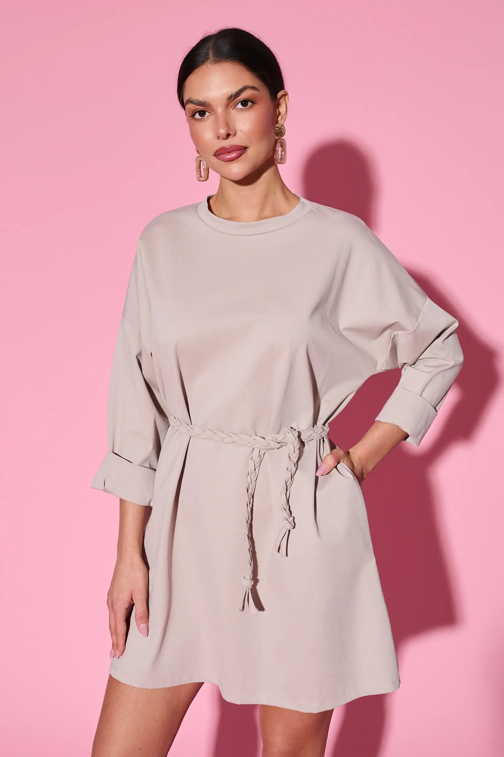 Sukienka o prostym, swobodnym kroju wykonana z gładkiego, miękko układającego się materiału, który nadaje całości elegancki i uniwersalny charakter. Model posiada klasyczny, okrągły dekolt oraz podwinięte rękawy o długości 3/4, co dodaje lekkości i casualowej swobody. W talii znajduje się ozdobny, pleciony pasek z tego samego materiału, pozwalający subtelnie podkreślić sylwetkę i regulować dopasowanie. Długość przed kolano sprawia, że sukienka jest komfortowa w noszeniu i odpowiednia na różne okazje.