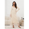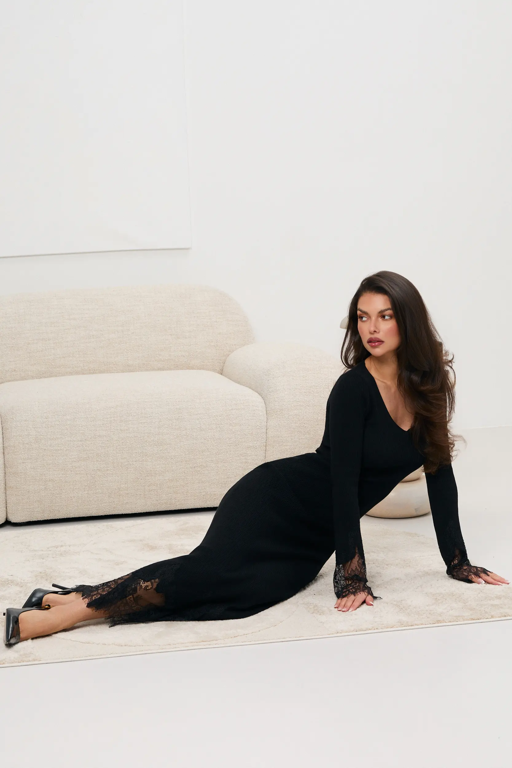 Dopasowana sukienka o długości maxi, która subtelnie podkreśla sylwetkę i eksponuje kobiece kształty. Model z długim rękawem wykończonym delikatną koronką nadaje całości eleganckiego i zmysłowego charakteru. Dekolt w kształcie litery V optycznie wysmukla szyję, a elastyczna, prążkowana dzianina zapewnia komfort noszenia i idealne dopasowanie. Dół sukienki został ozdobiony transparentną koronką z dekoracyjnym wykończeniem, co dodaje lekkości i wyjątkowego stylu.