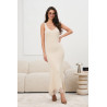 Dopasowana sukienka o długości maxi wykonana z elastycznej, prążkowanej dzianiny, która idealnie podkreśla sylwetkę i zapewnia komfort noszenia. Model na szerokich ramiączkach z kobiecym dekoltem w kształcie litery V subtelnie eksponuje linię ramion oraz szyi. Gładka, minimalistyczna forma została przełamana delikatnym, koronkowym wykończeniem u dołu, nadającym całości lekkości i elegancji. To propozycja łącząca ponadczasowy styl z nowoczesną, zmysłową linią.