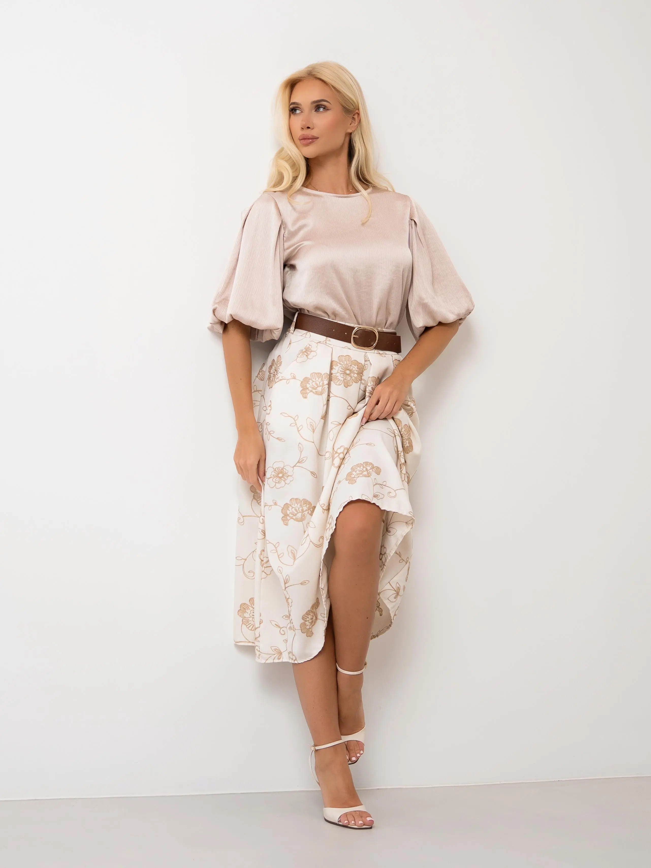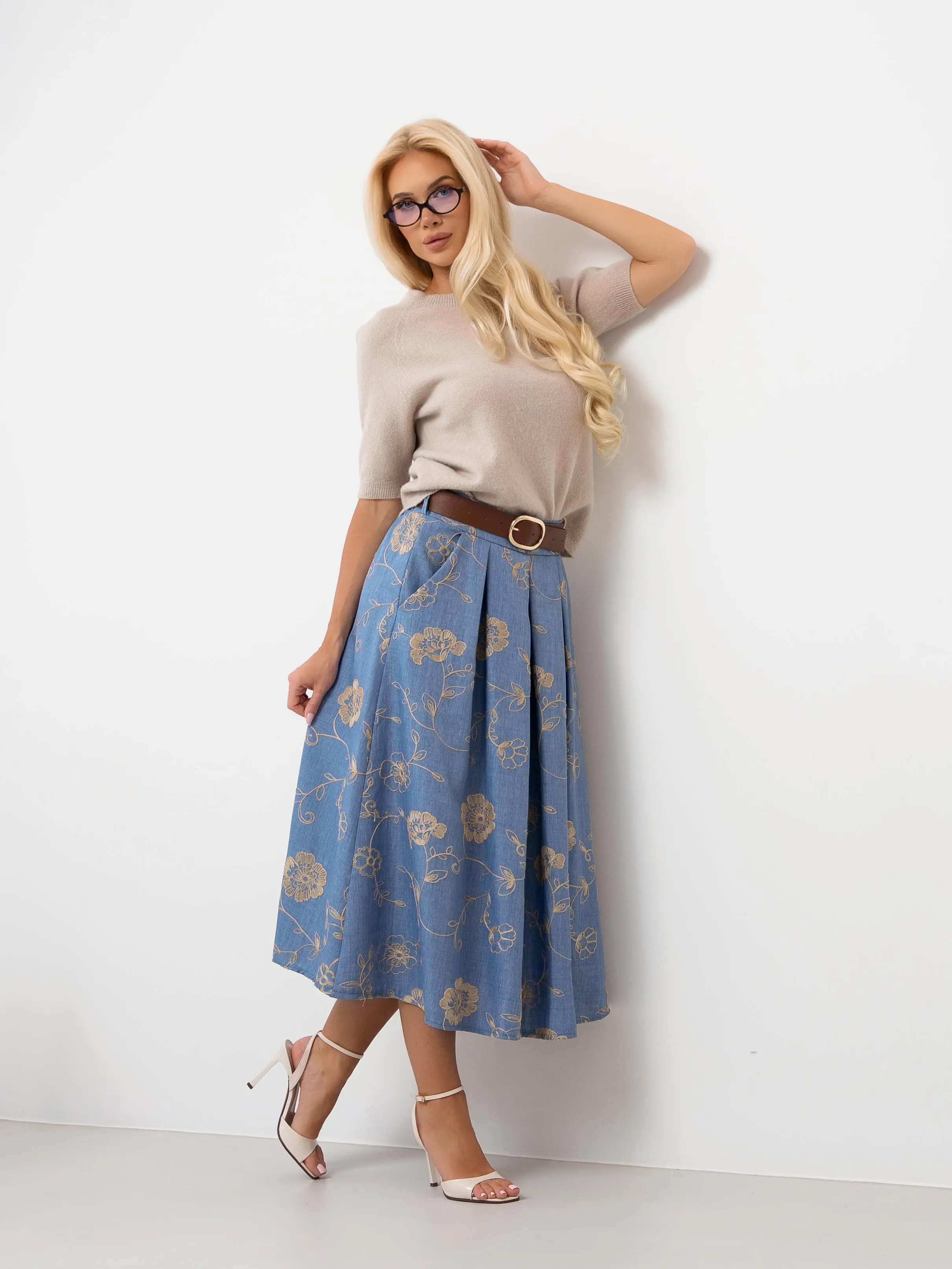 Spódnica midi o rozkloszowanym fasonie to kwintesencja kobiecego stylu i subtelności. Wykonana z lekkiego, zwiewnego materiału, została ozdobiona delikatnym, kwiatowym wzorem, który nadaje jej romantycznego charakteru. Wysoki stan z dekoracyjnymi zakładkami pięknie podkreśla talię, a szeroki, brązowy pasek z okrągłą klamrą dodaje całości wyrazistości. Swobodny krój zapewnia komfort noszenia i efektownie układa się w ruchu. To idealna propozycja zarówno do biura, jak i na wyjątkowe okazje, doskonale komponująca się z dopasowaną bluzką oraz sandałami na obcasie.