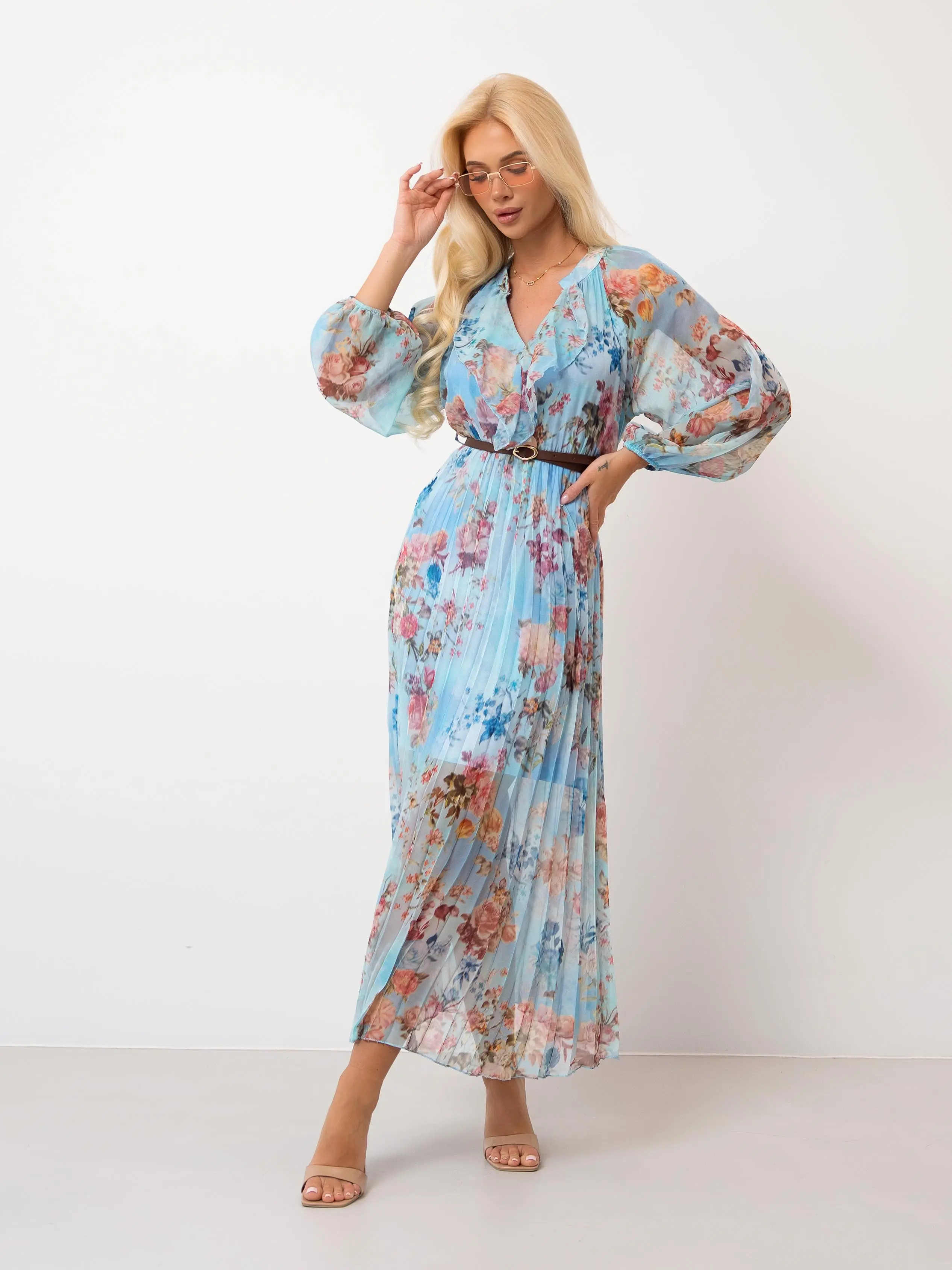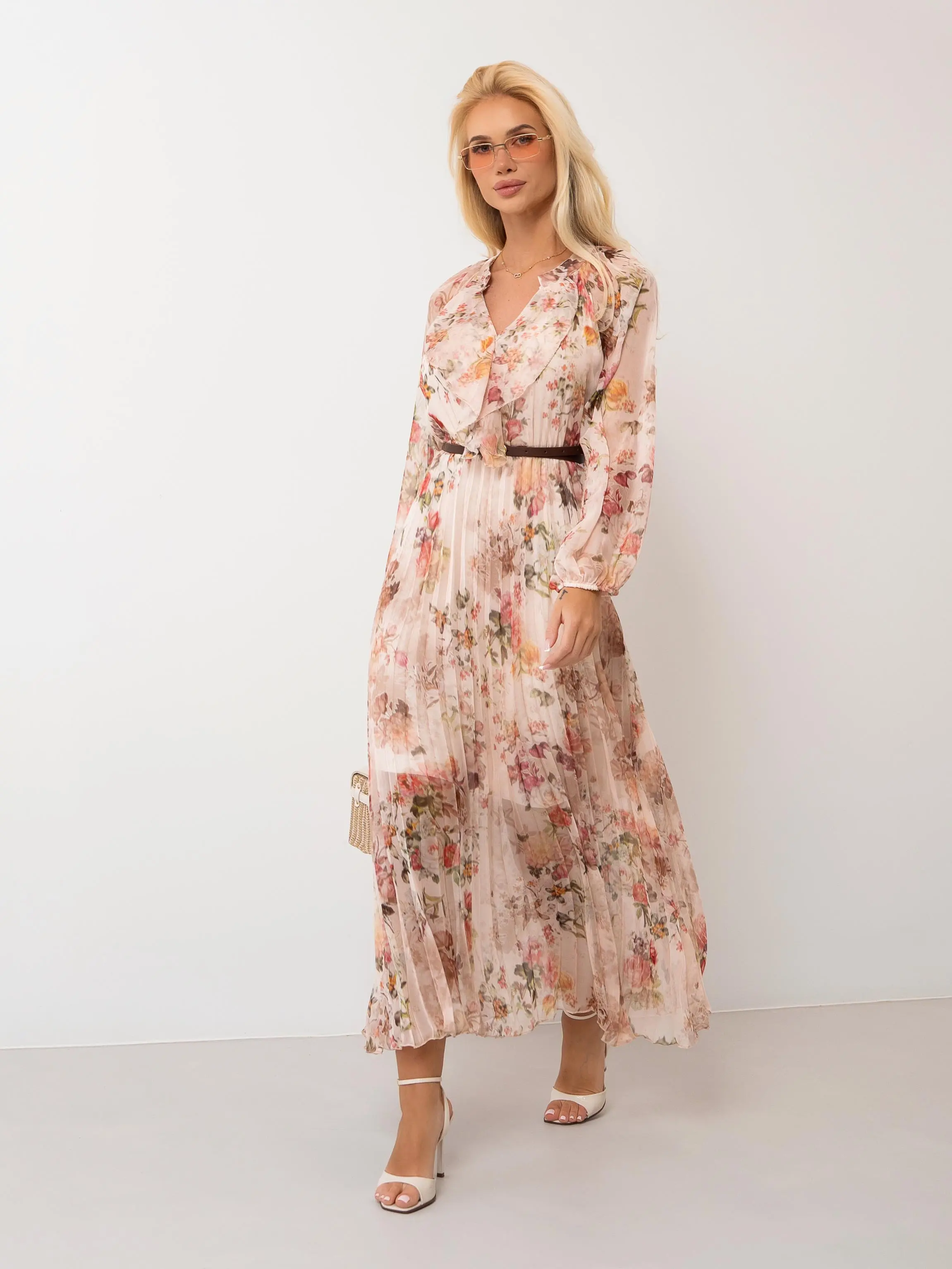 Elegancka sukienka maxi w romantycznym stylu zachwyca subtelnym, kwiatowym wzorem. Wykonana z lekkiego, zwiewnego materiału, posiada efektowne plisowanie na całej długości spódnicy, które nadaje sylwetce lekkości i dynamiki. Góra z dekoltem w serek wykończona jest delikatną falbaną, a długie, transparentne rękawy zakończone cienkim mankietem dodają całości klasy. Talia została wyraźnie podkreślona wąskim, ciemnym paskiem, co idealnie balansuje proporcje figury. To doskonała propozycja na letnie uroczystości, wesela czy eleganckie kolacje, łącząca kobiecy wdzięk z nowoczesnym szykiem.