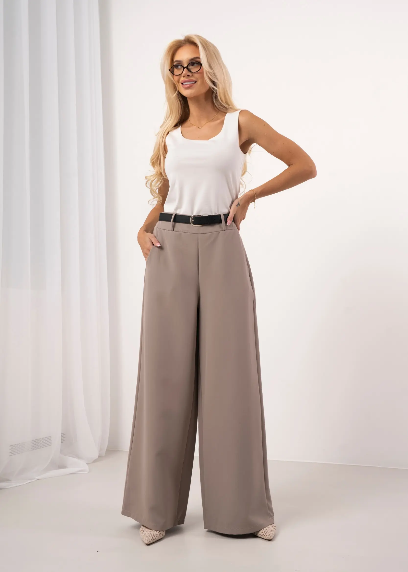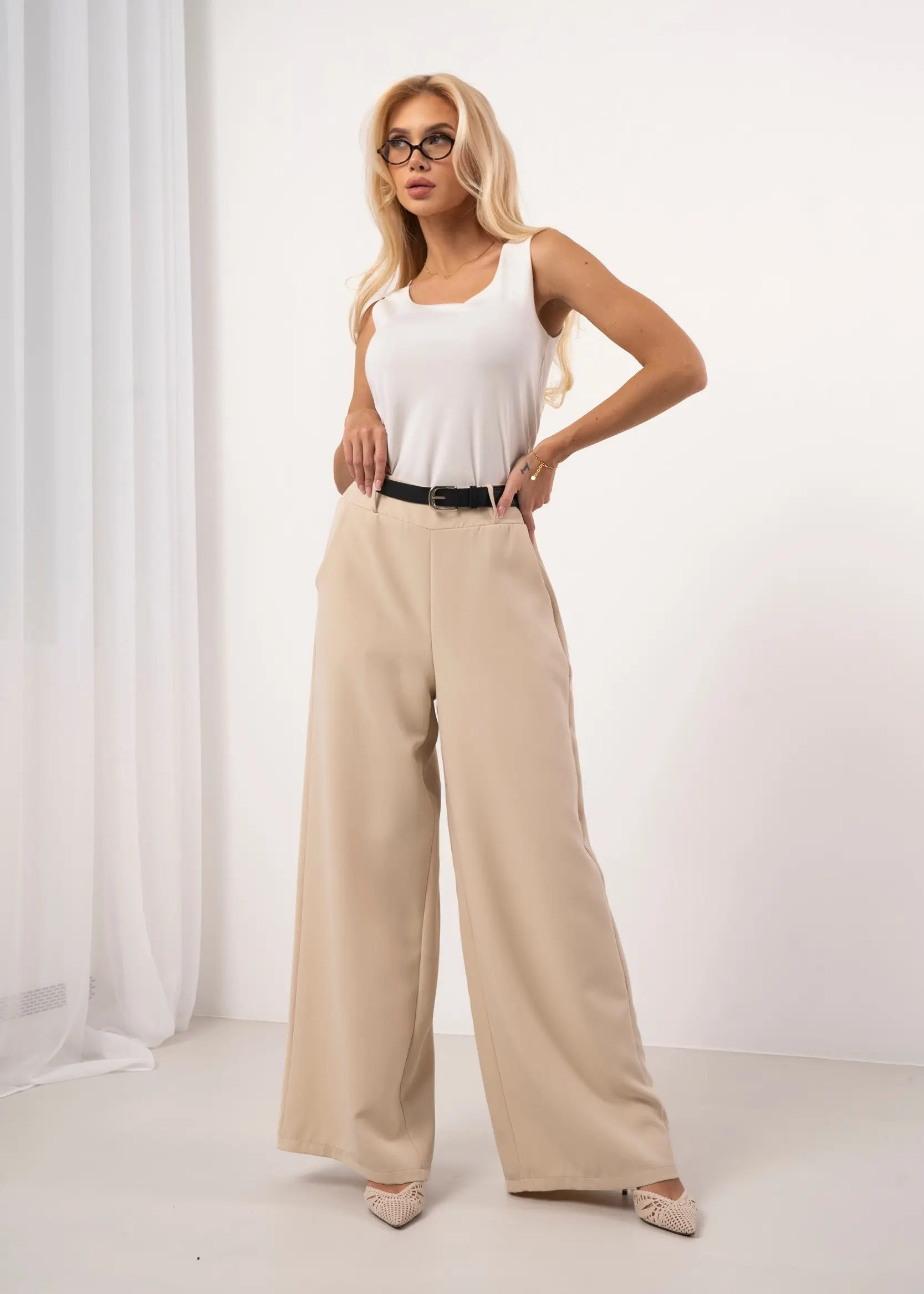 Spodnie z wysokim stanem o szerokim kroju typu wide leg, wykonane z gładkiej, lejącej tkaniny. Model z dopasowaną talią podkreśloną szlufkami, w zestawie z kontrastowym paskiem z klasyczną klamrą. Szerokie nogawki zapewniają swobodę ruchu i nowoczesną sylwetkę. Praktyczne kieszenie boczne dyskretnie wszyte w szwy. Idealna propozycja do biura oraz na wieczorne wyjścia.