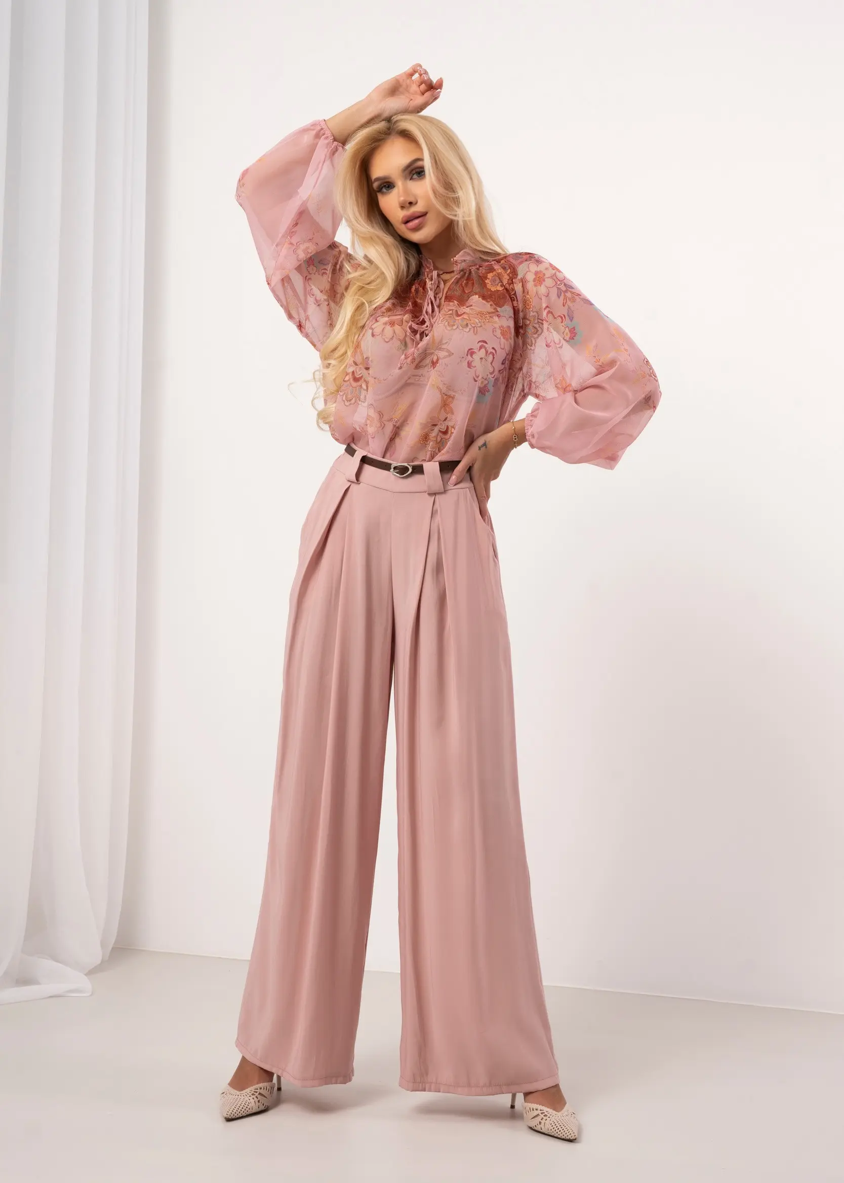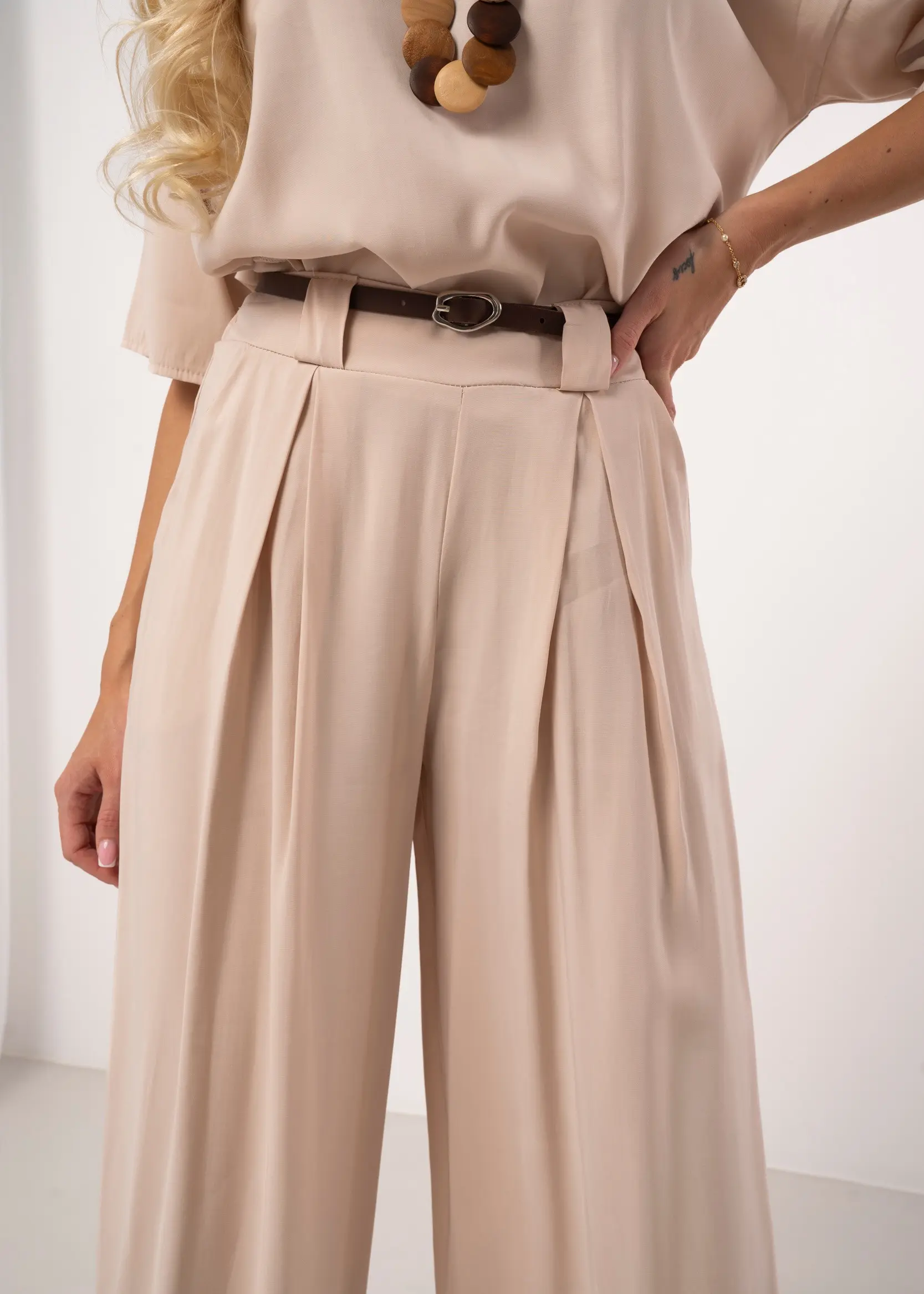 Spodnie o szerokim kroju wykonane z lejącej tkaniny. Model z wysokim stanem podkreślającym talię, wyposażony w szlufki oraz eleganckie zaszewki z przodu, które nadają sylwetce odpowiednią strukturę i objętość. Długie, luźne nogawki typu wide leg zapewniają swobodę ruchów i nowoczesny wygląd. Zapięcie na suwak i guzik ukryte w szwie. Idealna baza do stylizacji z dopasowanym body lub zwiewną koszulą. Minimalistyczny design łączący biurową elegancję z miejskim szykiem.