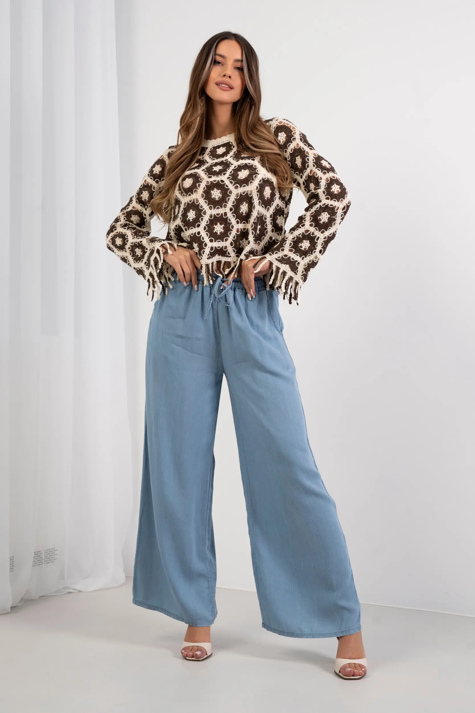 Spodnie o szerokim kroju wykonane z lekkiej, zwiewnej tkaniny o gładkim splocie. Model z wysokim stanem podkreślającym sylwetkę oraz elastycznym pasem z regulacją w formie cienkiego sznurka, co zapewnia idealne dopasowanie i komfort noszenia. Długie, luźno opadające nogawki o prostym fasonie nadają całości nowoczesny, swobodny charakter. Staranne wykończenie szwów oraz subtelna struktura materiału sprawiają, że projekt łączy w sobie elegancję z codziennym minimalizmem, wpisując się w najnowsze trendy.