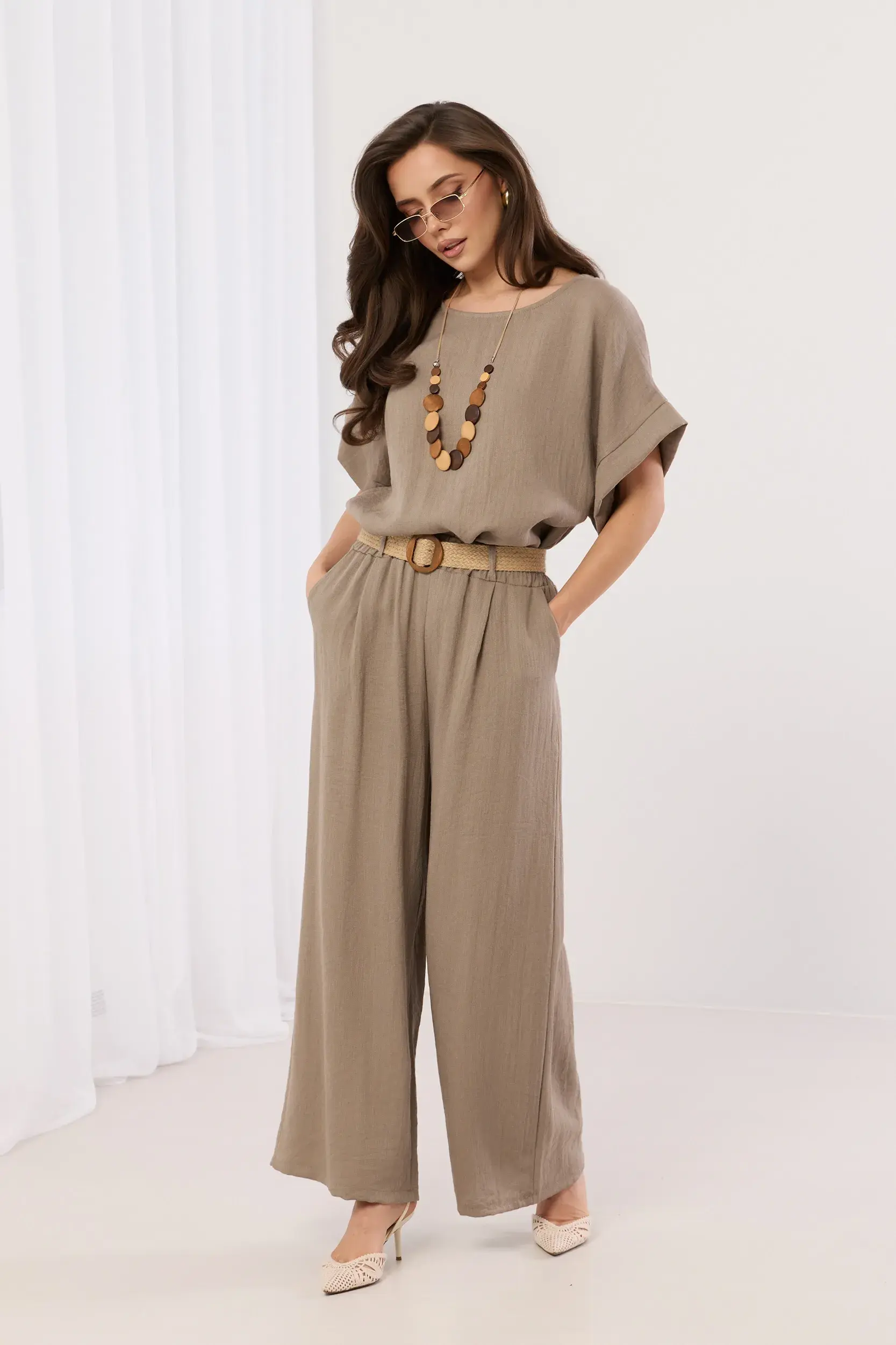 Spodnie z wysokim stanem z elastycznym pasem i subtelnymi marszczeniami, które nadają sylwetce lekkości. Model z dwiema kieszeniami bocznymi ukrytymi w szwach oraz szerokimi, swobodnie opadającymi nogawkami wykończonymi prostym przeszyciem. Minimalistyczny design i naturalny splot materiału zapewniają komfort noszenia oraz elegancki, letni wygląd. Idealne do zestawienia z paskiem z plecionki, tworząc spójną i nowoczesną stylizację na co dzień.