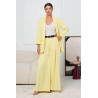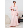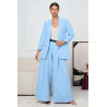 Szerokie spodnie o płynnej linii, które tworzą efekt lekkiej, wydłużonej sylwetki. Zaszewki z przodu nadają całości uporządkowany wygląd i delikatnie akcentują talię. W pasie pasek, który dopełnia fason i pozwala na komfortowe noszenie. Nogawki swobodnie opadają aż do dołu, dobrze pracując w ruchu. Po bokach dyskretne kieszenie. Model z wiosennej kolekcji, występujący w pastelowych odcieniach, łatwy do łączenia zarówno z lekkimi bluzkami, jak i prostymi topami czy koszulami.