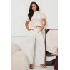 Spodnie o luźnym kroju z wysokim stanem, który porządkuje sylwetkę i zapewnia komfort noszenia. Model posiada zaszewki z przodu, które nadają formę w górnej części i subtelnie modelują linię bioder. Nogawki o prostej linii są delikatnie zwężane ku dołowi i wykończone prostym brzegiem, bez mankietów. Na przodzie nogawek zastosowano cięcia konstrukcyjne, podkreślające nowoczesny charakter fasonu. Pas z częściową gumą z tyłu zapewnia wygodne dopasowanie, a szlufki oraz dołączony pasek stanowią spójne wykończenie całości. Model sprawdzi się w codziennych stylizacjach oraz w bardziej dopracowanych zestawach.