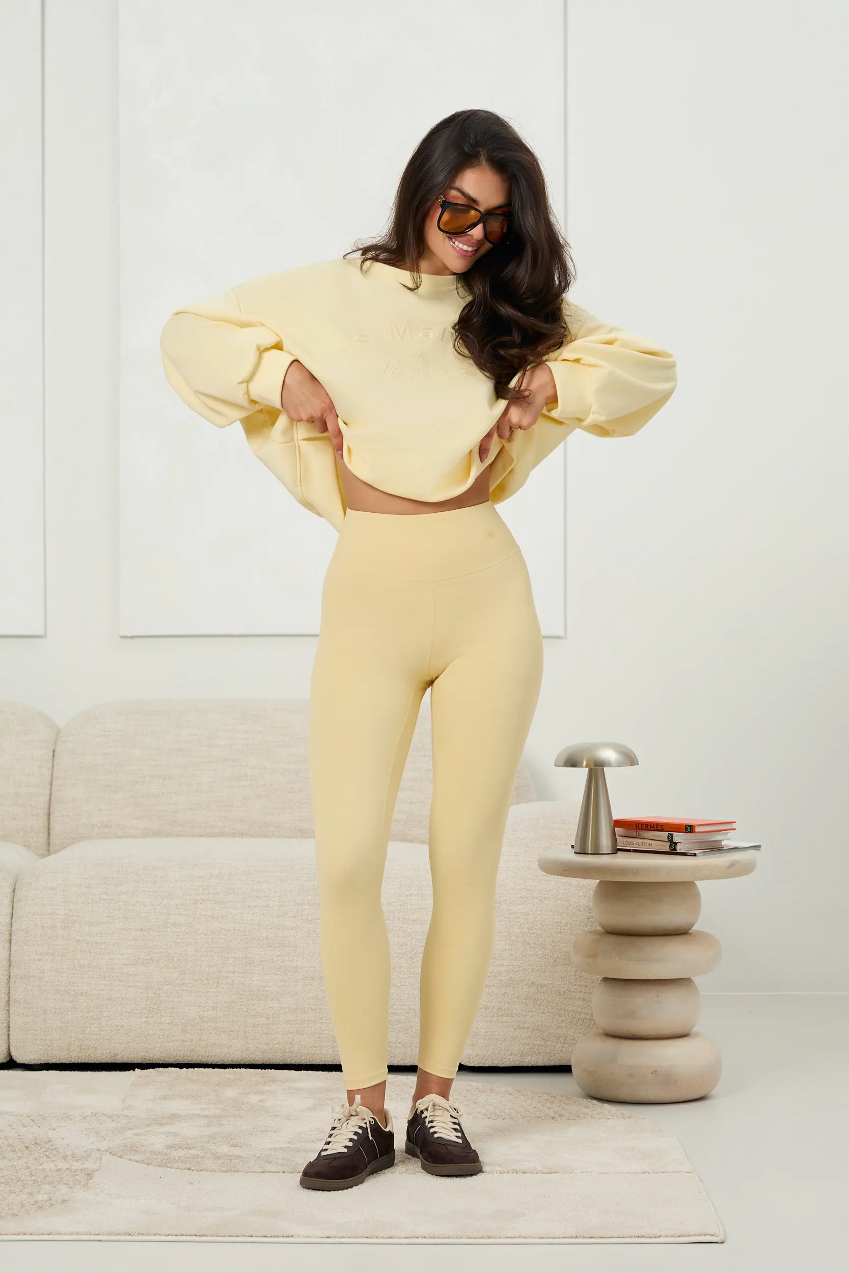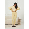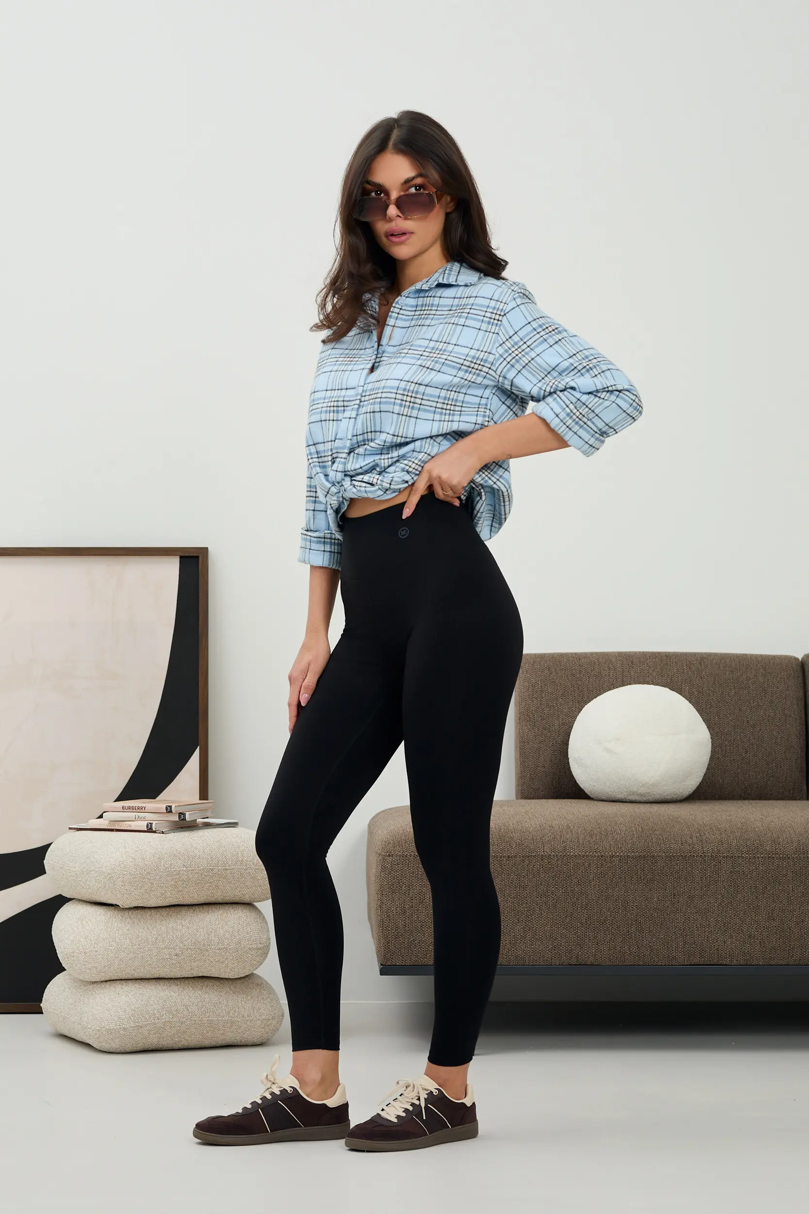 Legginsy o dopasowanym kroju z wysokim stanem, który stabilnie podtrzymuje talię i podkreśla linię sylwetki. Model wykonany z elastycznej, gładkiej dzianiny, która ściśle przylega do ciała i zapewnia komfort noszenia. Konstrukcja oparta na profilowanych przeszyciach oraz odpowiednio poprowadzonej linii tylnej części tworzy wyraźny efekt push up, unosząc i modelując pośladki. Szeroki pas bez dodatkowych szwów i zapięć wygładza okolice brzucha i utrzymuje legginsy na miejscu przez cały dzień. Nogawki długie i wąskie, z czystym wykończeniem, optycznie wydłużają nogi. Model z efektem push up sprawdzi się zarówno w stylizacjach sportowych, jak i codziennych, noszony samodzielnie lub jako element kompletu.