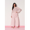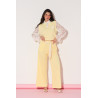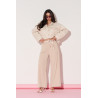 Stylowe spodnie o szerokim, luźnym kroju z prostą nogawką, które łączą wygodę z eleganckim wyglądem. Model wyposażony jest w ozdobny materiałowy pasek w talii, który subtelnie podkreśla sylwetkę i dodaje całości kobiecego charakteru. Wysoki stan zapewnia komfort noszenia oraz optycznie wydłuża nogi. Spodnie wykonane są z lekkiego, miękko układającego się materiału, który dobrze dopasowuje się do ruchu ciała i sprawdzi się zarówno w codziennych stylizacjach, jak i bardziej eleganckich zestawach. Doskonale komponują się z bluzkami, koszulami oraz krótkimi kardiganami.