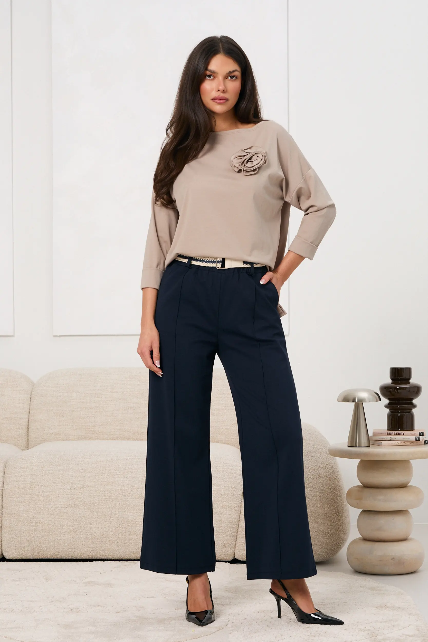 Spodnie o eleganckim, szerokim kroju z prostą nogawką, wykonane z gładkiego, lekko lejącego materiału, który dobrze układa się na sylwetce i zapewnia komfort noszenia. Model z wysokim stanem podkreślającym talię, z delikatnymi zaszewkami z przodu optycznie wydłużającymi nogi. Spodnie posiadają klasyczne zapięcie na guzik i zamek, stylowy pasek oraz praktyczne kieszenie boczne, co łączy funkcjonalność z ponadczasowym stylem.