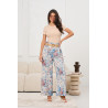 Spodnie wyróżniają się szerokimi nogawkami o prostym kroju, które zapewniają swobodę ruchów i elegancką linię sylwetki, wysokim stanem podkreślającym talię oraz dekoracyjnym paskiem z klamrą, który dodaje całości wyrafinowanego charakteru. Uszyte z lekkiego, przyjemnego w dotyku materiału, idealnie sprawdzają się w cieplejsze dni, a subtelny kwiatowy wzór w pastelowej kolorystyce nadaje im kobiecy, świeży wygląd.