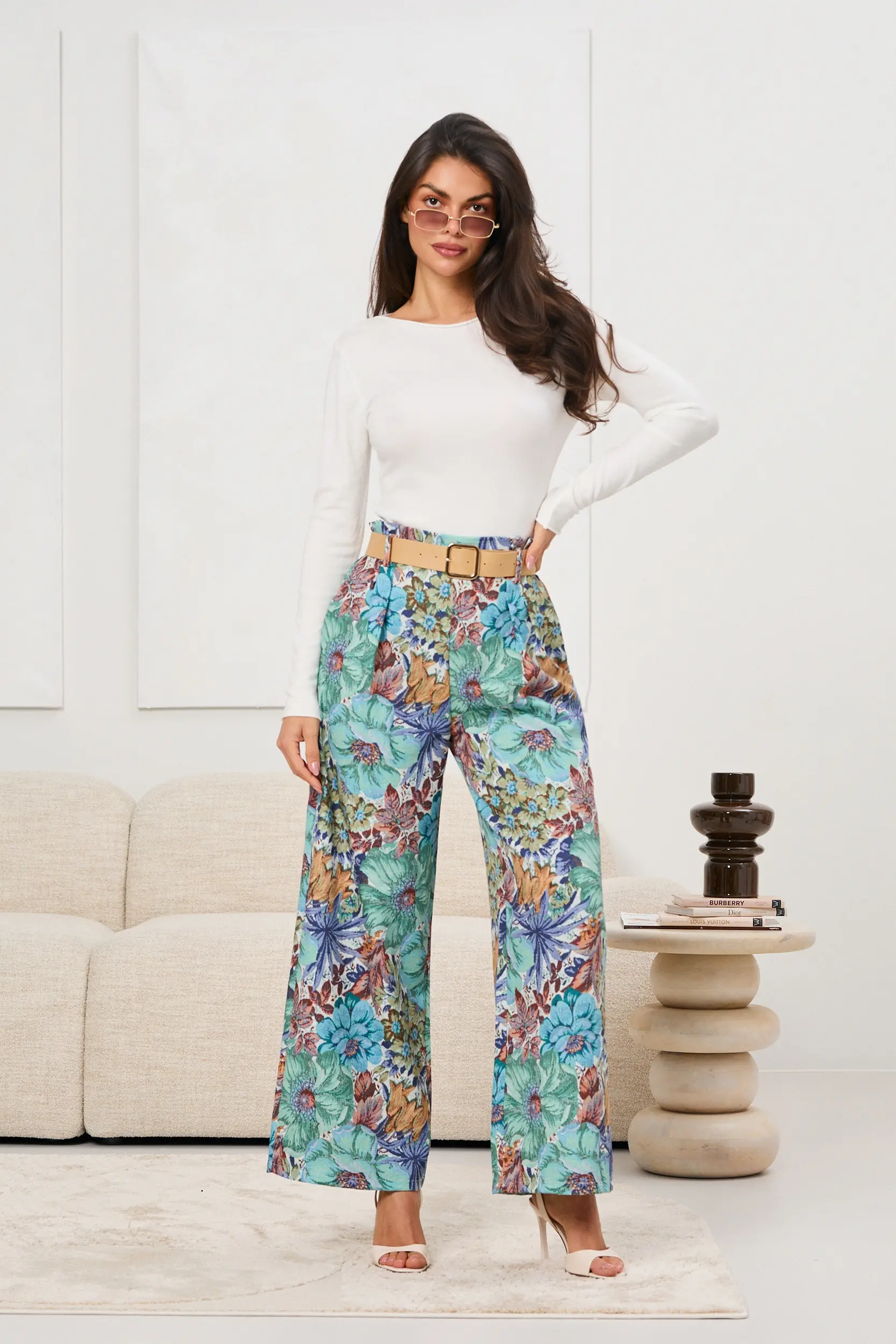 Eleganckie spodnie damskie o szerokich nogawkach, wykonane z lekkiego, przyjemnego w dotyku materiału, wyróżniają się efektownym, wielobarwnym wzorem florystycznym, który nadaje stylizacji wyrazisty, letni charakter. Model posiada wysoki stan podkreślający talię, klasyczne zapięcie oraz szlufki umożliwiające noszenie paska, a prosta, luźna nogawka zapewnia komfort noszenia i swobodę ruchów. Spodnie świetnie układają się na sylwetce, optycznie ją wydłużając.
