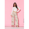 Spodnie o szerokim, prostym kroju z wysokim stanem, wykonane z lekkiej, przyjemnej w dotyku tkaniny, zdobione delikatnym kwiatowym wzorem w pastelowej kolorystyce, który nadaje im kobiecego i świeżego charakteru; model posiada wygodne zakładki w pasie podkreślające talię, praktyczne kieszenie oraz zapięcie na suwak i guzik, a dołączony pasek z ozdobną klamrą dodatkowo akcentuje sylwetkę i dodaje stylizacji eleganckiego wykończenia.