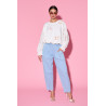 Spodnie o luźnym, lekko zwężanym ku dołowi kroju, wykonane z miękkiego i przyjemnego w dotyku materiału, który zapewnia komfort noszenia przez cały dzień. Spodnie utrzymane są w delikatnym odcieniu denimu, który nadaje im lekko casualowy charakter i sprawia, że łatwo dopasować je do wielu stylizacji. Model z wysokim stanem i elastyczną talią subtelnie dopasowuje się do sylwetki, podkreślając talię i gwarantując swobodę ruchów. Spodnie posiadają praktyczne kieszenie po bokach oraz nogawki o długości do kostek.