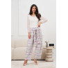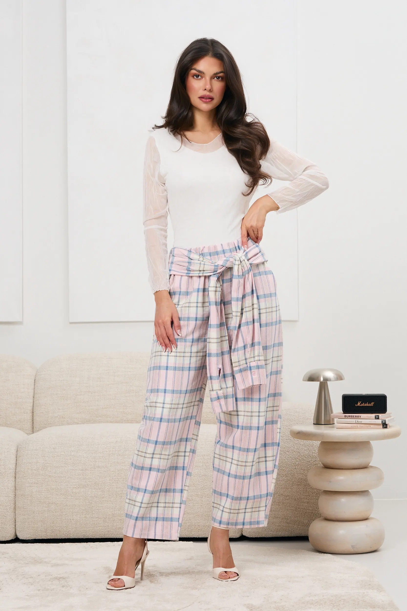 Pastelowe spodnie w kratę, wykonane z lekkiej, przewiewnej tkaniny, zapewniają komfort noszenia przez cały dzień. Szerokie nogawki o luźnym kroju pięknie układają się w ruchu i optycznie wydłużają sylwetkę. Wysoki stan podkreśla talię, a dekoracyjne wiązanie z przodu dodaje im kobiecego, stylowego charakteru. Delikatna krata w odcieniach różu i błękitu nadaje całości świeżości i modnego wyrazu, czyniąc je idealnym wyborem zarówno na co dzień, jak i na bardziej eleganckie okazje.