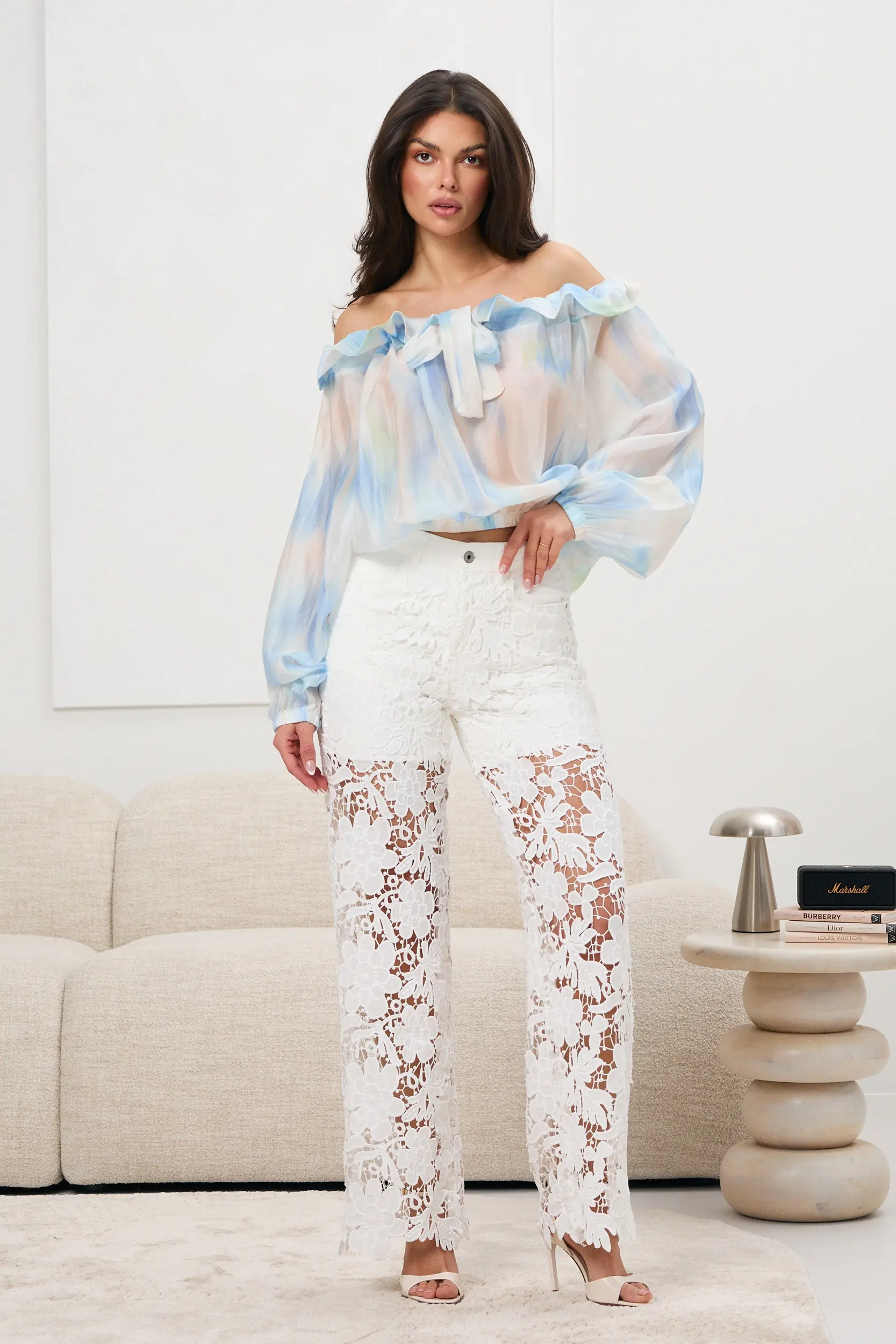 Spodnie z wysokim stanem wykonane z efektownej, ażurowej koronki o wyrazistym, kwiatowym wzorze. Model o prostych, lekko rozszerzanych nogawkach subtelnie wydłuża sylwetkę i nadaje stylizacji lekkości. Transparentna struktura materiału przełamana jest krótszą podszewką w górnej części, co podkreśla dekoracyjny charakter tkaniny. Zapinane z przodu na guzik i zamek, doskonale dopasowują się w talii, łącząc elegancję z nowoczesnym, kobiecym stylem.