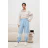 Spodnie o luźnym, komfortowym kroju wykonane z lekkiego, przyjemnego w dotyku materiału, który zapewnia swobodę ruchów i wygodę noszenia przez cały dzień. Model posiada elastyczną gumkę w pasie oraz przy nogawkach, dzięki czemu idealnie dopasowuje się do sylwetki. Szerokie nogawki ozdobione są efektowną, białą koronkową aplikacją w dolnej części, która nadaje całości kobiecego, subtelnego charakteru i wyróżnia spodnie na tle klasycznych fasonów.