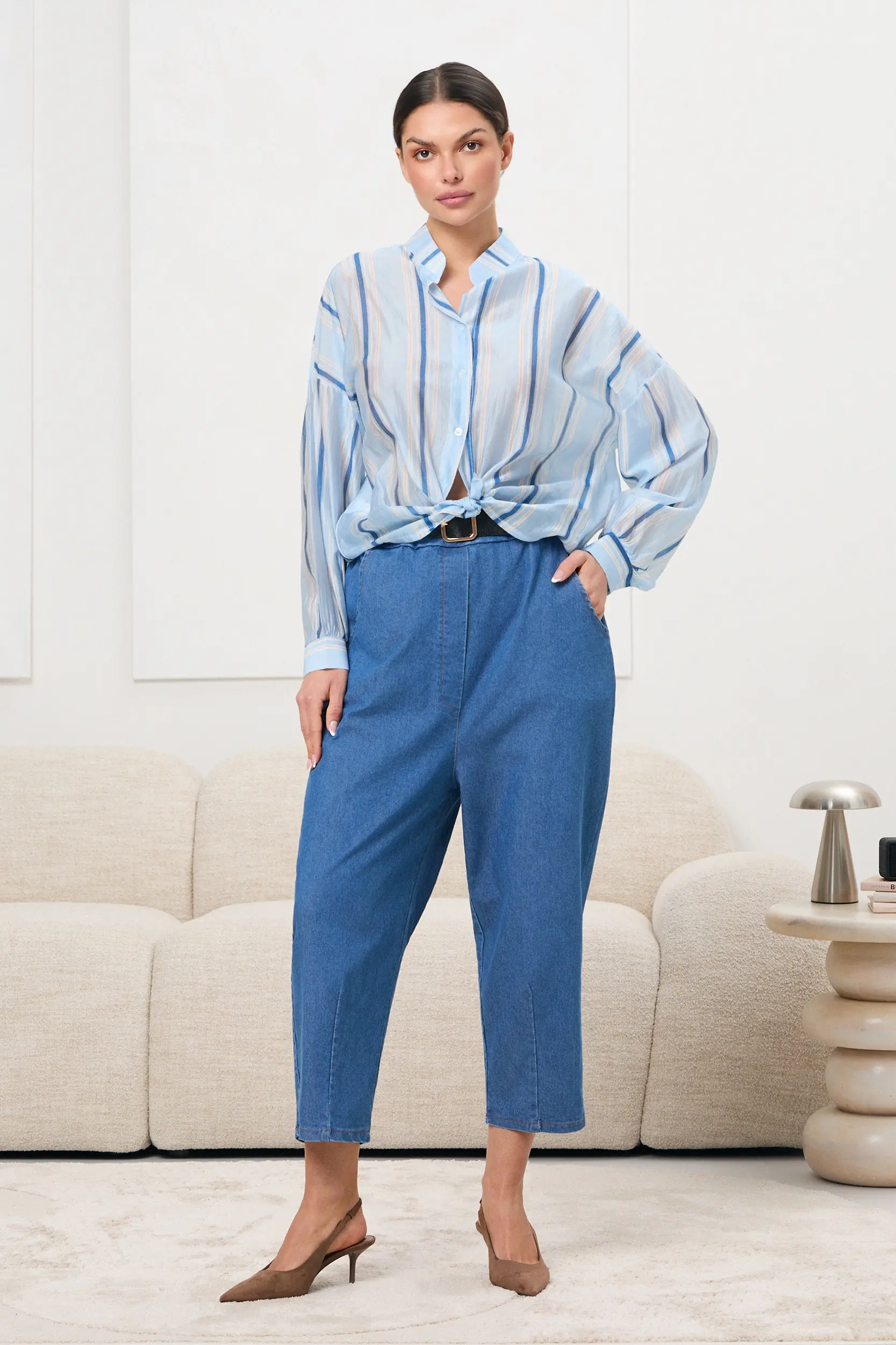 Spodnie o luźnym, zwężanym ku dołowi kroju z podwyższonym stanem, który podkreśla talię i zapewnia komfort noszenia. Model o długości 7/8 subtelnie eksponuje kostkę, optycznie wysmuklając sylwetkę. W pasie wszyta guma gwarantuje wygodne dopasowanie, a kieszenie po bokach dodają funkcjonalności. Gładki, miękko układający się materiał zapewnia swobodę ruchów, a minimalistyczne wykończenie sprawia, że fason sprawdzi się zarówno w stylizacjach codziennych, jak i bardziej eleganckich.