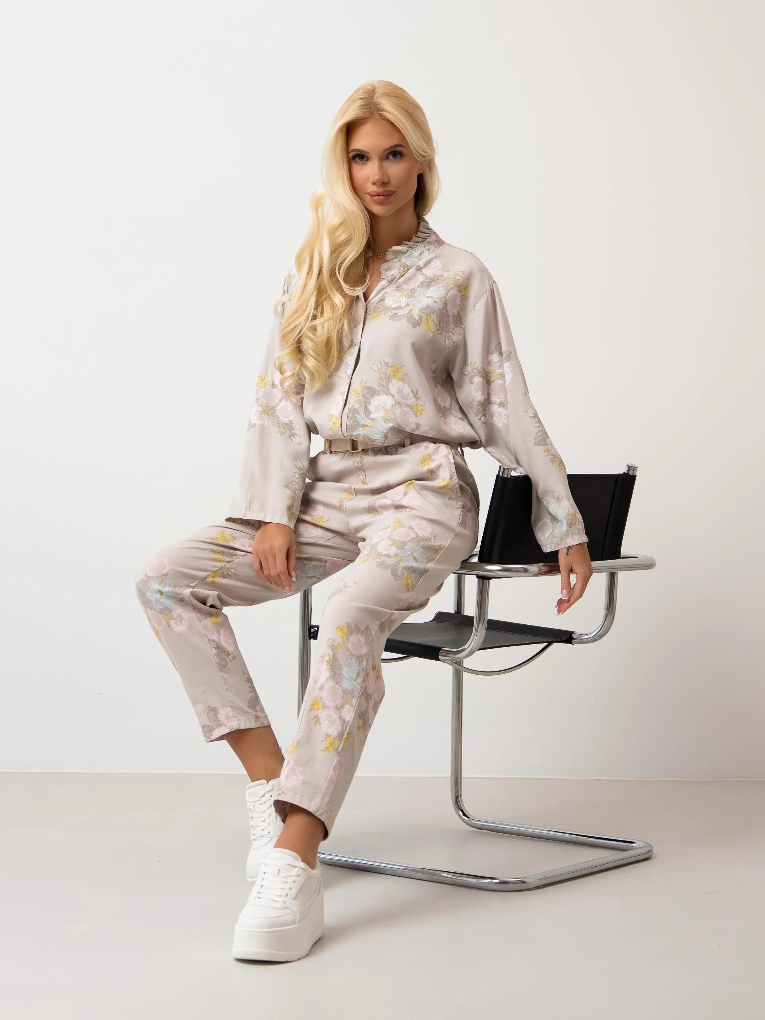 Spodnie damskie o swobodnym kroju, wykonane z lekkiego materiału, ozdobione delikatnym, romantycznym wzorem kwiatowym w pastelowych barwach. Model charakteryzuje się prostymi, lekko zwężanymi nogawkami o długości przed kostkę, co nadaje sylwetce nowoczesny i lekki wygląd. Elastyczna talia z marszczeniem zapewnia komfort noszenia i idealne dopasowanie, a dołączony pasek z jasnej taśmy ze złotą klamrą podkreśla talię, dodając całości szyku. Spodnie posiadają praktyczne, wsuwane kieszenie boczne.