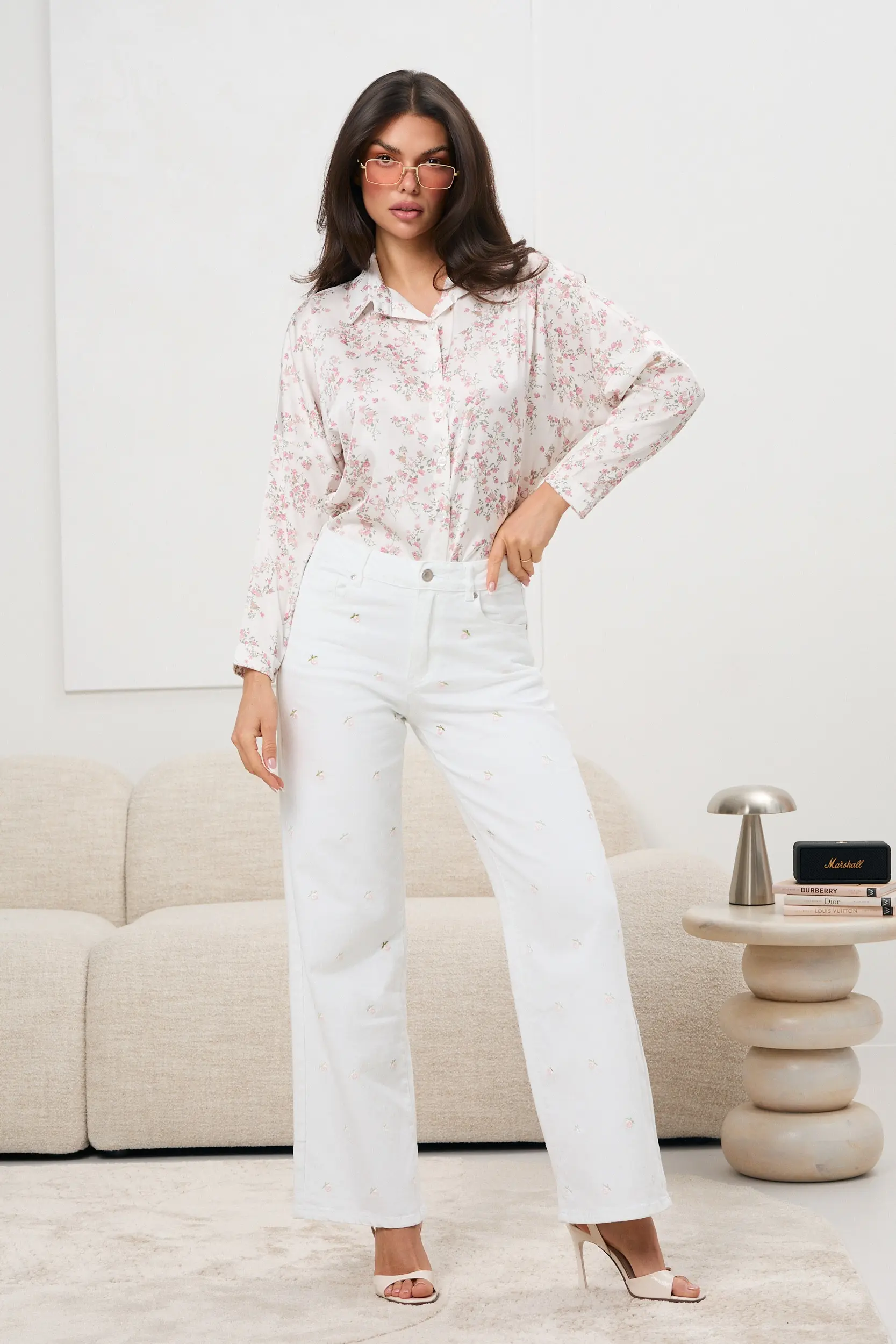 Jeansy o prostym, lekko rozszerzanym kroju z wysokim stanem, który pięknie podkreśla talię i wysmukla sylwetkę. Wykonane z miękkiego, przyjemnego w dotyku denimu, zapewniają komfort noszenia przez cały dzień. Model zapinany na guzik i zamek, z klasycznymi kieszeniami z przodu i z tyłu. Całość zdobi subtelny haft w postaci drobnych, różowych kwiatów z zielonymi listkami, nadający spodniom romantycznego i świeżego charakteru.