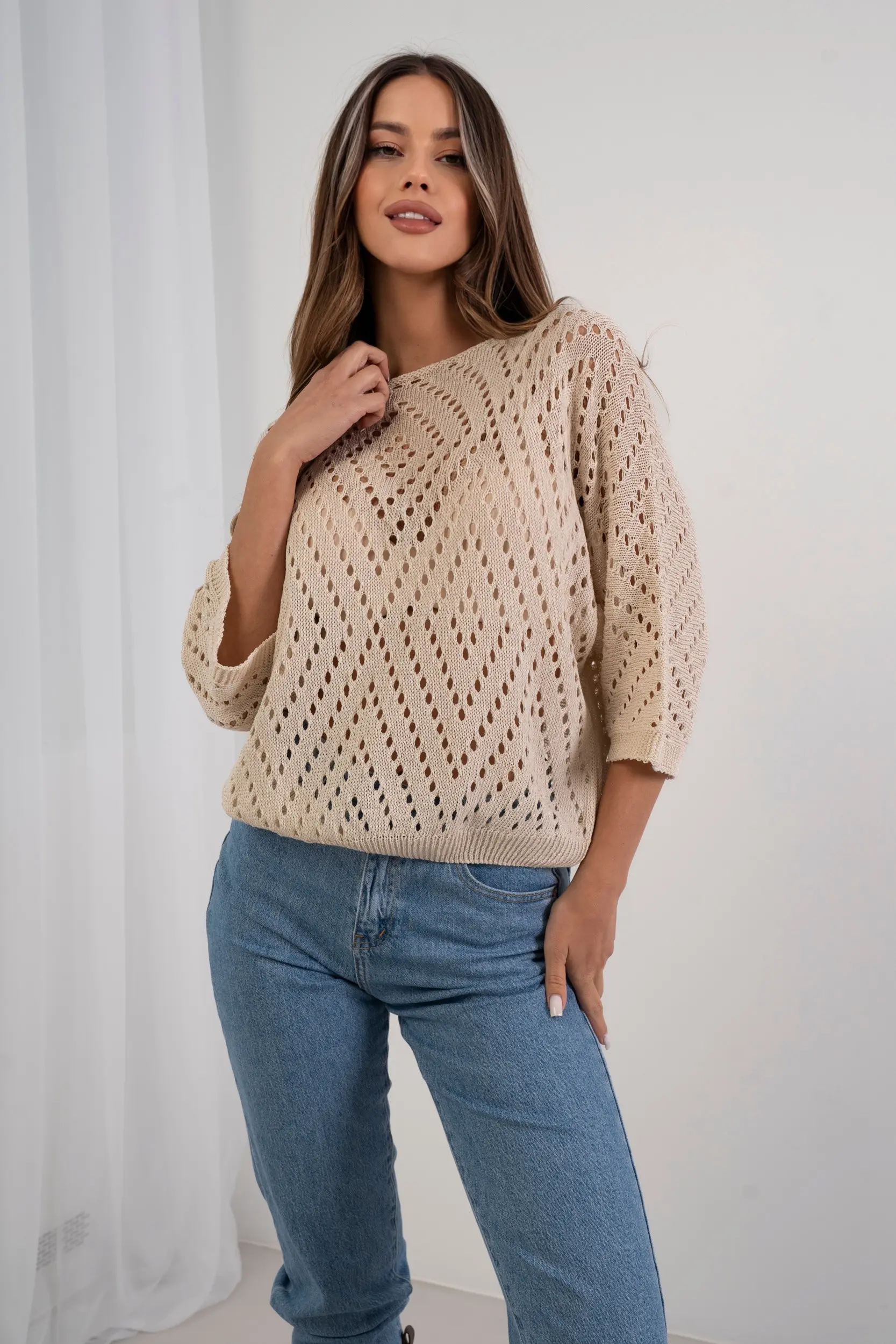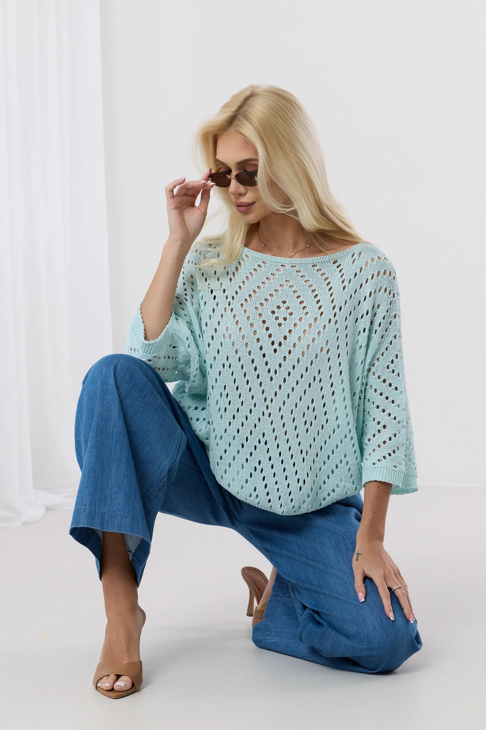 Sweter o luźnym kroju typu oversize to kwintesencja kobiecego szyku w wydaniu casual. Wykonany z dzianiny o ażurowym splocie, zachwyca subtelnymi wzorami geometrycznymi, które nadają mu lekkości i finezji. Model wyróżnia się szerokimi rękawami typu nietoperz, wykończonymi estetycznym ściągaczem, co zapewnia swobodę ruchów i nowoczesny wygląd.