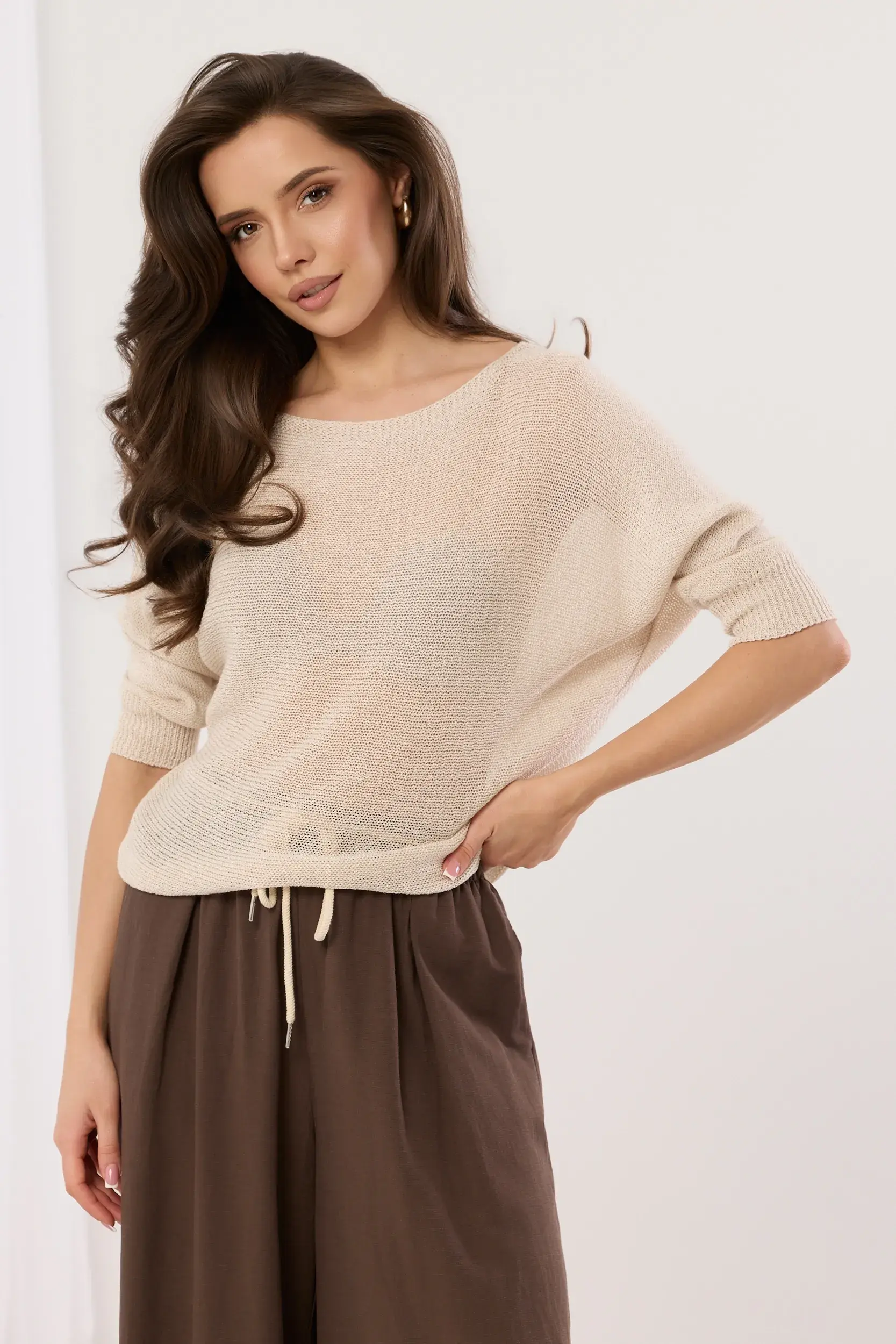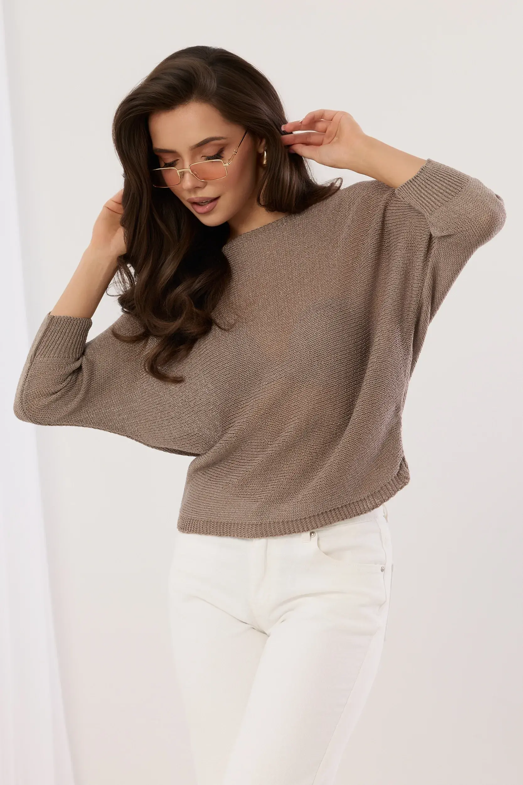Dzianinowy sweter o luźnym kroju wykonany z lekkiej przędzy o subtelnym połysku. Model z okrągłym dekoltem i obniżoną linią ramion, która nadaje całości swobodny charakter. Długie rękawy wykończone szerokim, elastycznym ściągaczem. Wyjątkowy detal w postaci rozcięcia na plecach, zwieńczonego eleganckim wiązaniem na satynową kokardę w tym samym tonie. Prosty dół z delikatnym wykończeniem. Idealna propozycja łącząca minimalistyczną formę z kobiecym, wyrafinowanym akcentem.