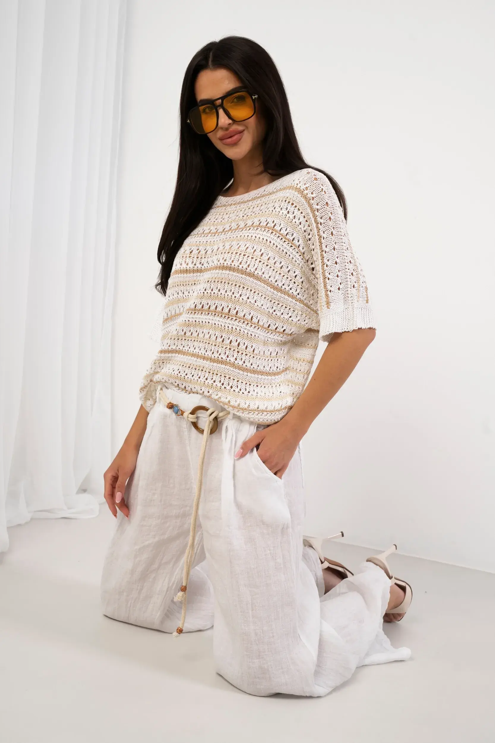 Ażurowy sweter o luźnym kroju wykonany z przyjemnej w dotyku dzianiny z domieszką błyszczącej nitki, która nadaje całości subtelnego rozświetlenia. Model z okrągłym dekoltem oraz krótkim rękawem o obniżonej linii ramion, co zapewnia swobodę ruchów i nowoczesną sylwetkę. Wykończenie w postaci splotu o zróżnicowanej teksturze tworzy efektowny wzór w poziome pasy. Dół oraz mankiety zakończone delikatnym ściągaczem. Idealna propozycja do warstwowych stylizacji, łącząca w sobie lekkość i wyrafinowany detal.