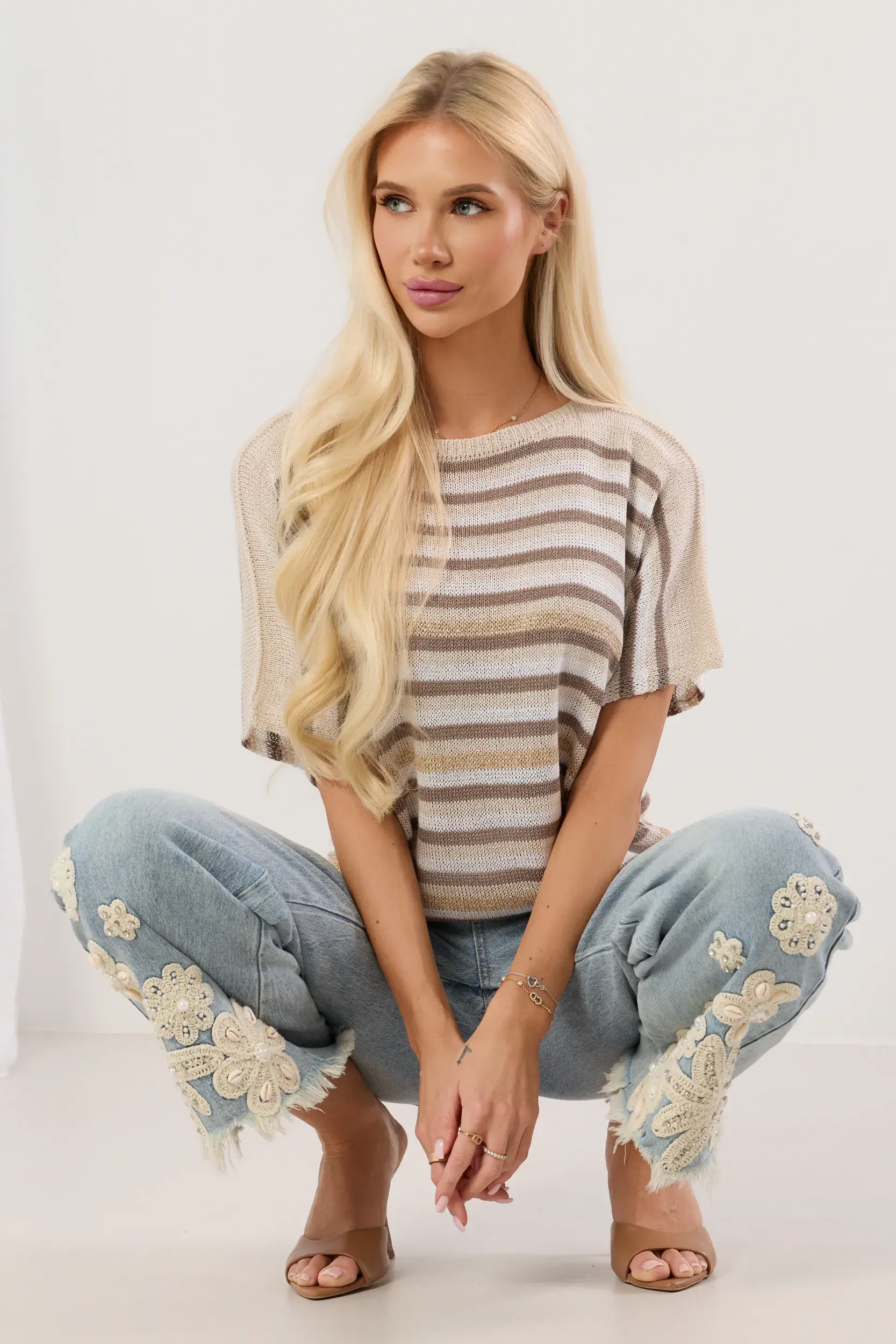 Luźny sweter z delikatnej dzianiny o luźnym splocie, zdobiony metaliczną nitką wplecioną w strukturalne poziome paski na całej powierzchni. Model o swobodnym kroju oversize z obniżonymi ramionami i szerokimi, krótkimi rękawami typu kimono. Posiada klasyczny, okrągły dekolt wykończony prążkowanym ściągaczem. Wykończenie dołu i rękawów jest elastyczne, z grubszą krawędzią. Ten lekki i przewiewny element garderoby to idealne połączenie miejskiej elegancji i stylu casual, dodające blasku codziennym, warstwowym stylizacjom.