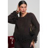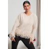 Dzianinowy sweter wykończony efektownymi frędzlami na dole i przy rękawach. Luźniejszy fason zapewnia wygodę i swobodę noszenia, a dekoracyjne wykończenia dodają mu wyrazistego, nowoczesnego charakteru. Idealny, jeśli chcesz w prosty sposób nadać stylizacji odrobinę nonszalancji i modowego akcentu.