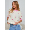 Sweter z krótkim rękawem i okrągłym dekoltem wykończonym ściągaczem. Powierzchnię zdobi rozmieszczony równomiernie haft z motywem truskawek, który nadaje całości lekki, graficzny charakter. Luźniejsze dopasowanie zapewnia swobodę ruchu i nowoczesny wygląd. Wykończenia przy dekolcie, rękawach i u dołu podkreślają czystą formę modelu. Sweter zaprojektowany do codziennych stylizacji o miejskim charakterze.