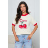Dzianinowy sweter o regularnym kroju z krótkim rękawem. Model z konstrukcją typu raglan, która subtelnie podkreśla ramiona i nadaje sylwetce harmonijne proporcje, wykończony kontrastową lamówką przy dekolcie oraz rękawach akcentującą formę projektu. Przód zdobiony wyrazistym haftem z motywem wiśni i typograficznym detalem, który przełamuje minimalistyczny krój i nadaje całości wyrazisty, fashionowy charakter. Sweter łączy klasyczną formę z dekoracyjnym akcentem, sprawdzając się zarówno w codziennych stylizacjach, jak i w bardziej świadomych, modowych zestawieniach.