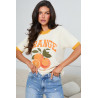 Sweter z kolekcji wiosennej z wyrazistym, mocnym motywem pomarańczy. Model wykonany z lekkiej, miękkiej dzianiny, zaprojektowany w luźnym, komfortowym kroju z reglanową linią ramion, która zapewnia swobodę i nowoczesną sylwetkę. Krótkie rękawy wykończone kontrastowym ściągaczem podkreślają konstrukcję, a okrągły dekolt zachowuje czystą, minimalistyczną formę. Przód zdobi haftowany motyw pomarańczy uzupełniony napisem, stanowiący centralny element projektu i nadający całości świeżości oraz energii charakterystycznej dla kolekcji wiosennej. Model idealny do budowania lekkich, sezonowych stylizacji z wyraźnym, modowym akcentem.