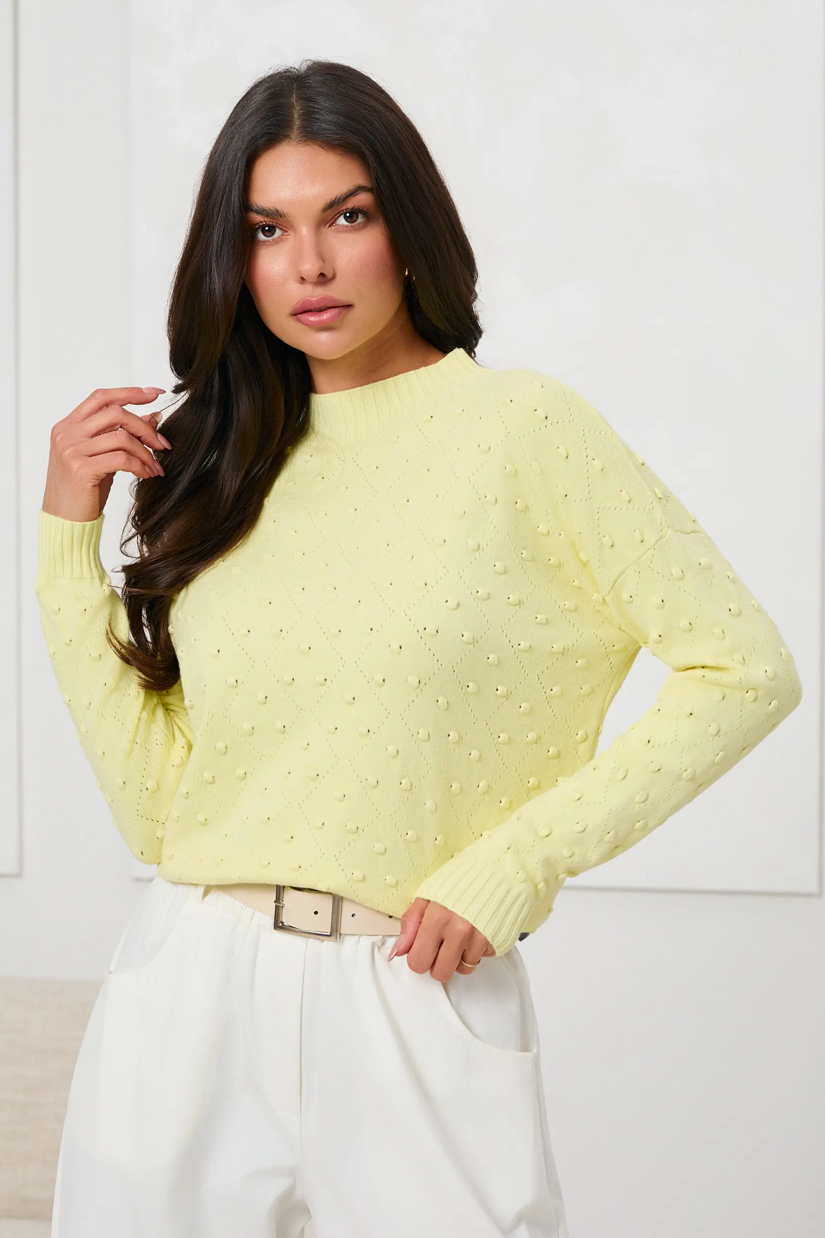 Sweter o prostym kroju z półgolfem wykończonym miękką stójką, która subtelnie podkreśla linię szyi. Wykonany z dzianiny strukturalnej o delikatnym, ażurowym splocie, uzupełnionej wypukłymi grochami rozmieszczonymi na całej powierzchni. Trójwymiarowe kropki nadają materiałowi wyrazistości i dekoracyjnego charakteru, jednocześnie zachowując lekkość formy. Dzianina jest elastyczna i przyjemna w dotyku, dobrze układa się na sylwetce i zapewnia komfort noszenia. Długie rękawy oraz dół swetra wykończone prążkowanymi ściągaczami porządkują linię fasonu i dopełniają całość.