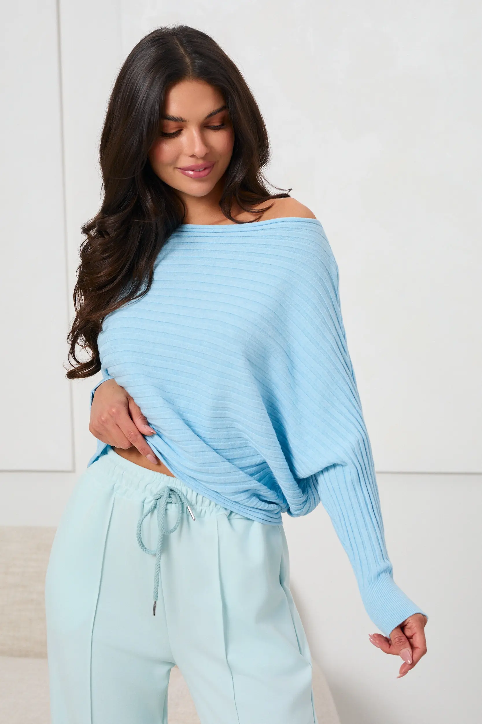 Sweter o bardzo mocno oversize’owym kroju z wyraźnie obniżoną linią ramion, który buduje luźną, miękką sylwetkę. Wykonany z elastycznej, prążkowanej dzianiny, dobrze układającej się na ciele i zapewniającej komfort noszenia. Szeroki dekolt o linii łódki podkreśla górną część sylwetki i nadaje całości swobodnego charakteru. Długie rękawy o obszernej formie są zwężane ku dołowi i wykończone ściągaczami, co porządkuje proporcje i nadaje konstrukcji wyrazistą linię. Dół swetra również wykończony ściągaczem, pozwalającym na regulowanie długości i sposobu układania formy.