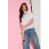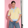 Dzianinowy sweter z krótkim rękawem o prostej, lekko luźnej formie. Model z kołnierzykiem polo oraz krótkim zapięciem na dekoracyjne, perłowe guziki. Całość wykonana w żakardowej technice, z wyraźnym wzorem w grochy, który stanowi główny element dekoracyjny. Dwukolorowa dzianina podkreśla wzór oraz wykończenia przy kołnierzyku, rękawach i dole swetra. Krój zapewnia swobodę noszenia i dobre układanie się na sylwetce, bez efektu dopasowania. Idealny do stylizacji z jeansami, spodniami z wysokim stanem lub spódnicą.