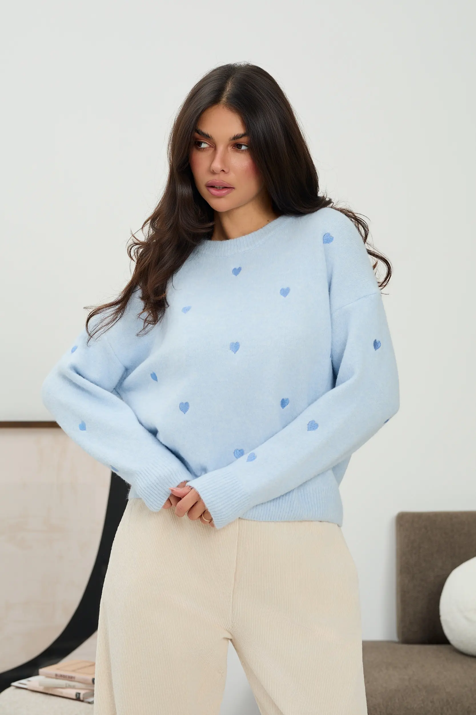 Miękki dzianinowy sweter o swobodnym kroju, łączący codzienny komfort z dekoracyjnym detalem. Model wykonany z dzianiny ozdobionej haftowanymi sercami rozmieszczonymi na całej powierzchni. Klasyczny, okrągły dekolt oraz długie rękawy nadają całości ponadczasowy charakter. Lekko luźna forma pozwala na naturalne układanie się na sylwetce. Ściągacze przy dekolcie, mankietach i u dołu porządkują fason. Sweter sprawdzi się w codziennych stylizacjach z jeansami lub spódnicą, dodając całości subtelnego, dekoracyjnego akcentu.