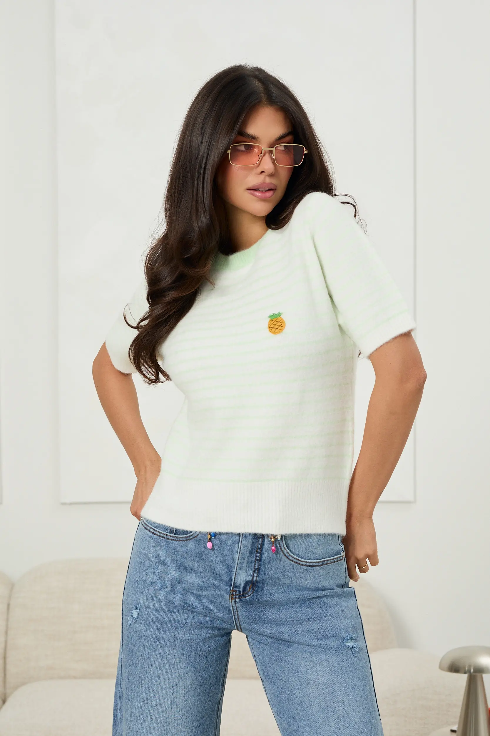 Sweter o klasycznym, prostym kroju w delikatne paski utrzymane w pastelowych tonach, które nadają całości świeżego, wiosennego charakteru. Model z krótkim rękawem oraz regularną linią ramion tworzy czystą, ponadczasową formę, dobrze układającą się na sylwetce. Haftowany motyw ananasa umieszczony na wysokości klatki piersiowej stanowi wyrazisty, a jednocześnie subtelny akcent, który przełamuje minimalistyczny charakter modelu. Dół oraz rękawy wykończone elastycznym ściągaczem, co zapewnia komfort noszenia i estetyczne wykończenie. Uniwersalny element garderoby, który sprawdzi się zarówno w codziennych stylizacjach, jak i w bardziej dopracowanych zestawieniach na sezon wiosenny.