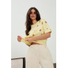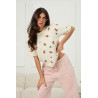 Uroczy, a jednocześnie stylowy sweter dzianinowy z krótkim rękawem, który idealnie wpisuje się w aktualne trendy włoskiej mody damskiej. Model wyróżnia się subtelnym, dziewczęcym wzorem w misie i delikatne kokardki, rozmieszczonym na całej powierzchni. Motyw ten nadaje całości lekkości i modowego charakteru. Uniwersalny fason dopasowany do różnych typów sylwetek. Sprawdzi się zarówno w codziennych stylizacjach, jak i w bardziej kobiecych zestawach.