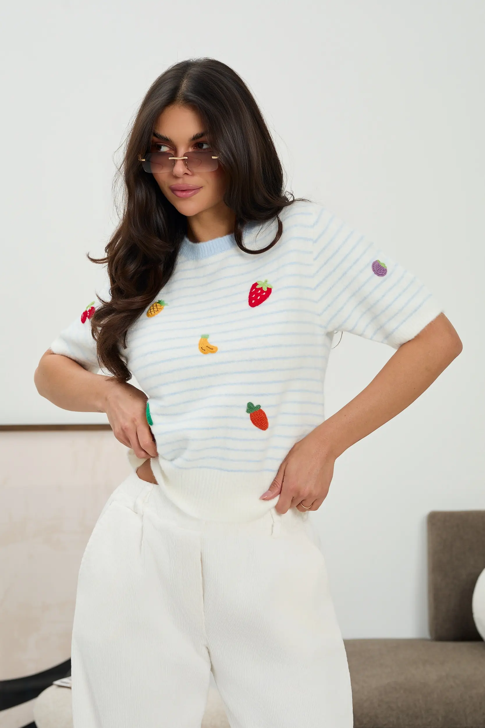 Stylowy sweter damski z krótkim rękawem, wykonany z miękkiej, przyjemnej w dotyku dzianiny. Model wyróżnia się delikatnym wzorem w paski oraz subtelnymi, haftowanymi motywami owoców, które nadają całości świeżego, letniego charakteru. Sweter ma lekko luźny fason, który pięknie układa się na sylwetce i zapewnia komfort noszenia. Krótki rękaw oraz oddychający materiał sprawiają, że model świetnie sprawdzi się w sezonie wiosenno-letnim, a także jako element stylizacji warstwowych.