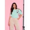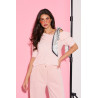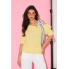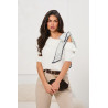 Miękki sweter wykonany z przyjemnej w dotyku, puszystej dzianiny, która zapewnia komfort noszenia i subtelne otulenie. Model z krótkim rękawem i lekko opadającą linią ramion nadaje sylwetce lekkości i kobiecego charakteru, a klasyczny, prosty krój sprawia, że sweter doskonale układa się na ciele. Okrągły dekolt wykończony jest miękkim ściągaczem, który podkreśla szyję i zwiększa wygodę noszenia. Stylowym akcentem jest ozdobna apaszka w groszki, wiązana na ramieniu, która dodaje całości elegancji i modowego wyrazu, pozwalając wyróżnić stylizację bez dodatkowych dodatków.