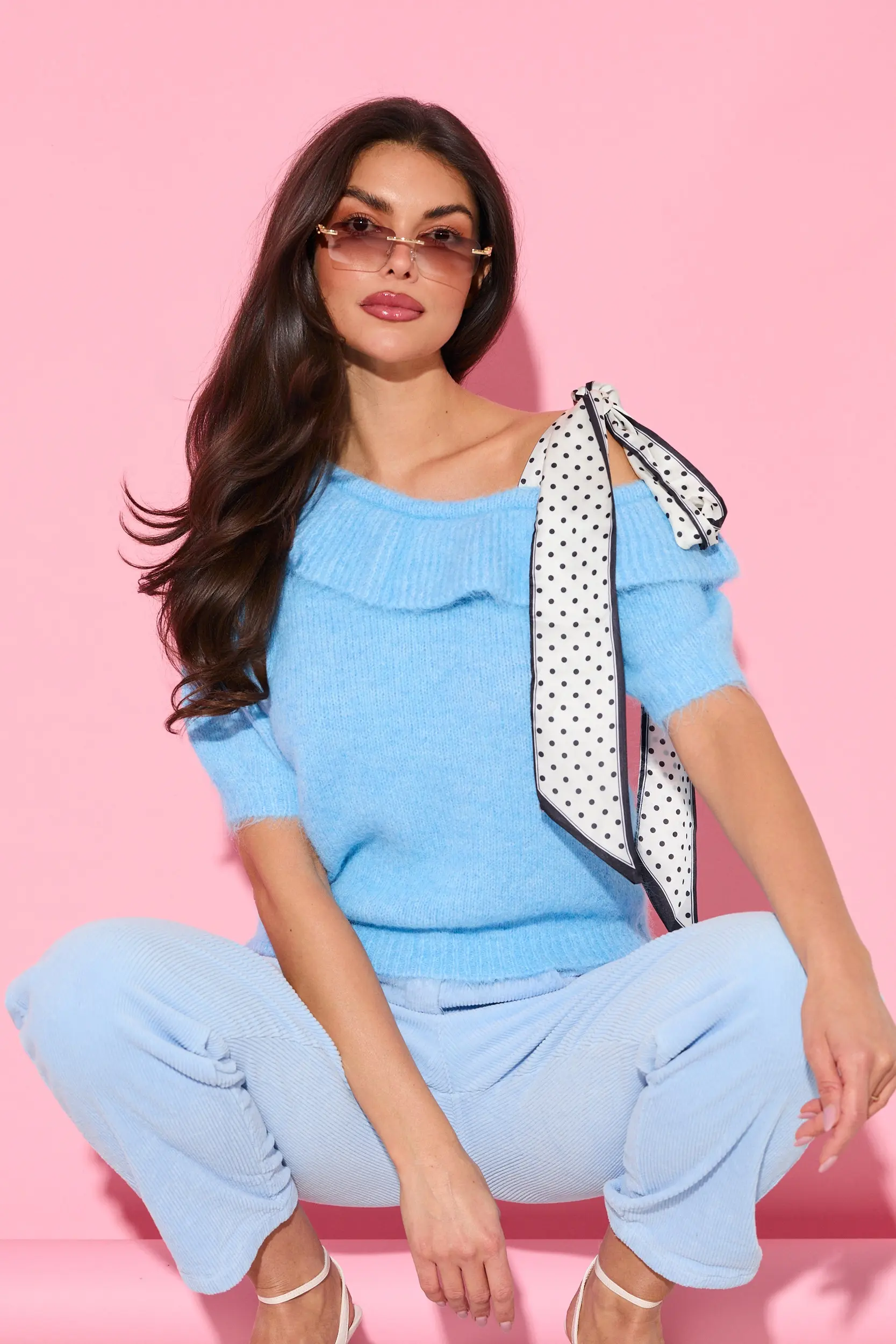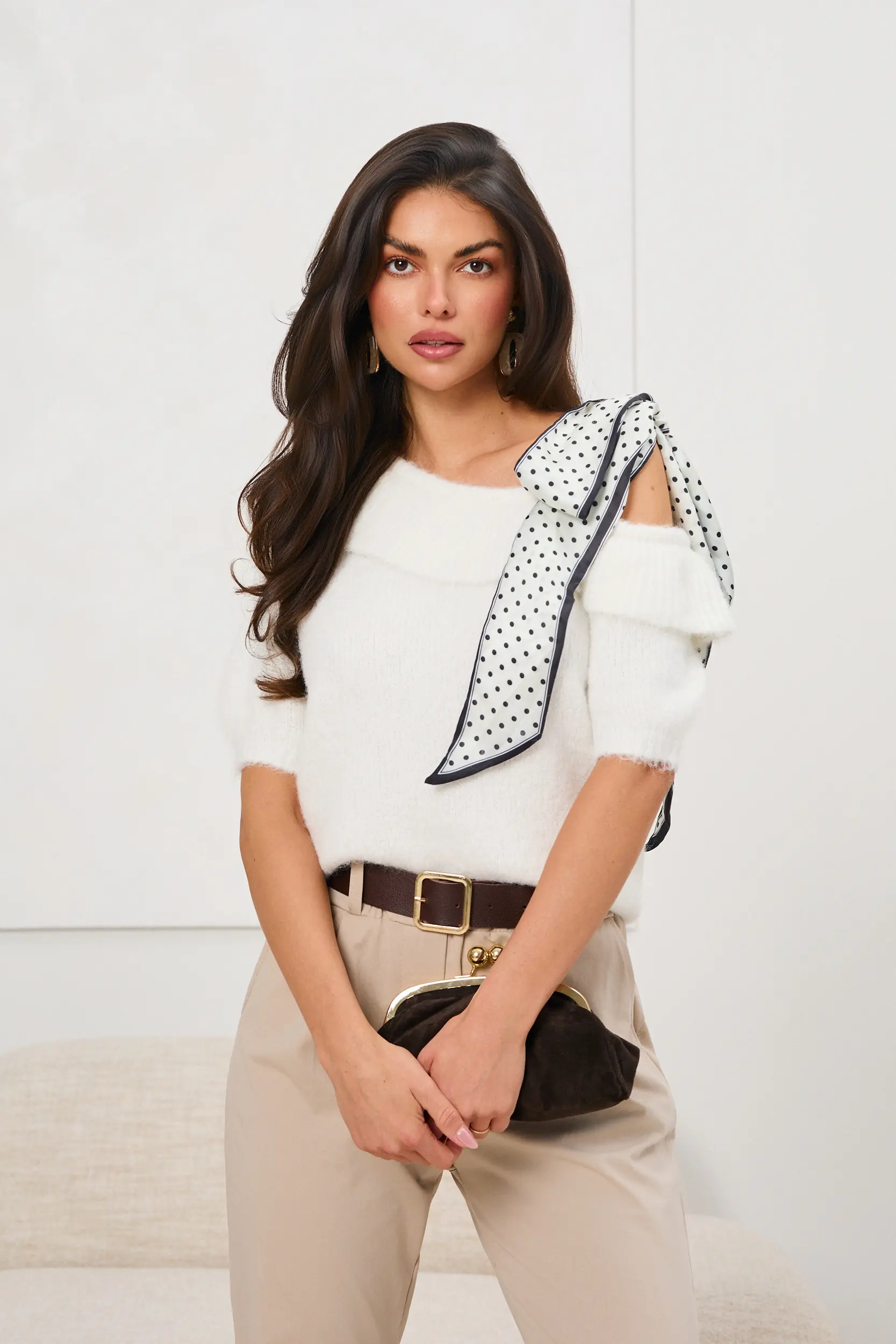 Sweter z odkrytym ramieniem i apaszką w grochy