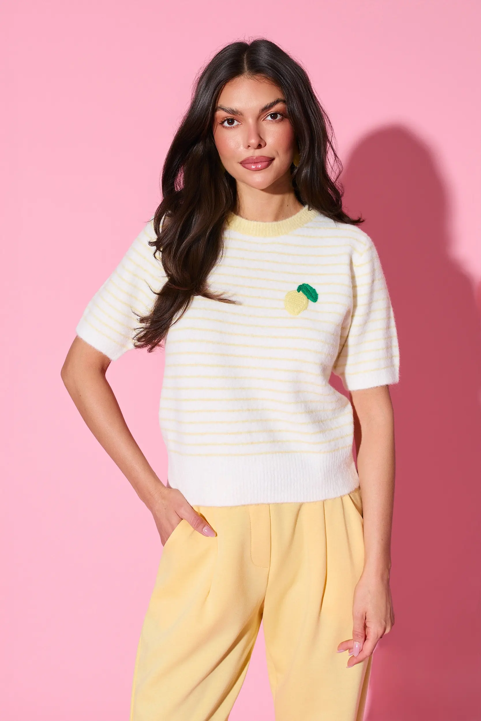 Sweter dzianinowy o prostym, lekko skróconym kroju, wykonany z miękkiej i przyjemnej w dotyku przędzy, która zapewnia komfort noszenia przez cały dzień. Ma krótki rękaw i klasyczny, okrągły dekolt wykończony delikatnym ściągaczem, dzięki czemu dobrze układa się na sylwetce. Subtelne, poziome paski nadają mu świeżego, letniego charakteru, a dekoracyjna aplikacja w kształcie cytryny na piersi stanowi stylowy i przyciągający uwagę detal.