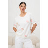 Sweter o swobodnym, lekko oversize’owym kroju zachwyca subtelną elegancją i delikatnymi detalami. Wykonany z dzianiny, zapewnia komfort noszenia przez cały dzień. Krótkie rękawy oraz klasyczny, okrągły dekolt nadają jej uniwersalnego charakteru. Całość ozdabiają haftowane, pastelowe kwiaty w odcieniach różu i beżu, rozmieszczone nieregularnie na materiale, które dodają romantycznego, kobiecego akcentu i lekkości stylizacji.