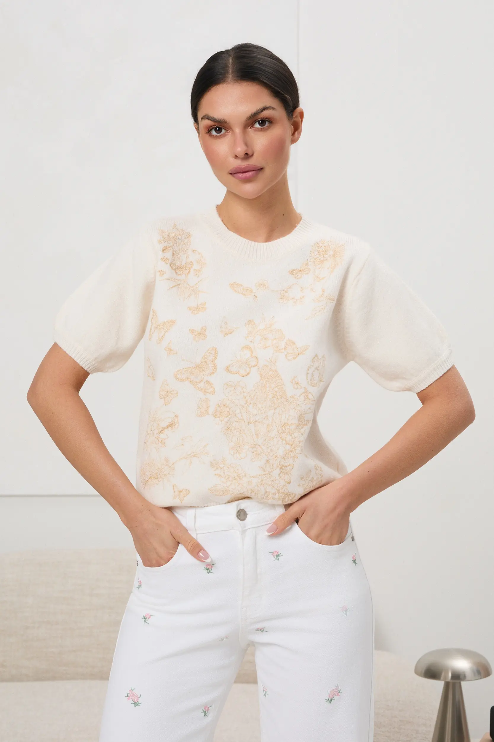 Sweter o delikatnym, miękkim splocie zachwyca subtelnym, kobiecym charakterem. Model z krótkim rękawem i klasycznym, okrągłym dekoltem pięknie układa się na sylwetce, podkreślając jej lekkość. Ozdobiony romantycznym motywem kwiatów i motyli, nadaje stylizacji finezyjnego wyrazu. Rękawy o lekko zaokrąglonej formie dodają mu objętości, a starannie wykończone ściągacze przy dekolcie i u dołu zapewniają komfort noszenia. Idealny do codziennych i bardziej eleganckich zestawów.